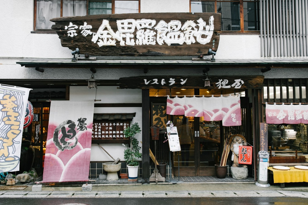 我和衣刀准备去吃面,来到金刀比罗宫怎么能错过小丸子也吃过的面馆呢!先在店前打卡一张。