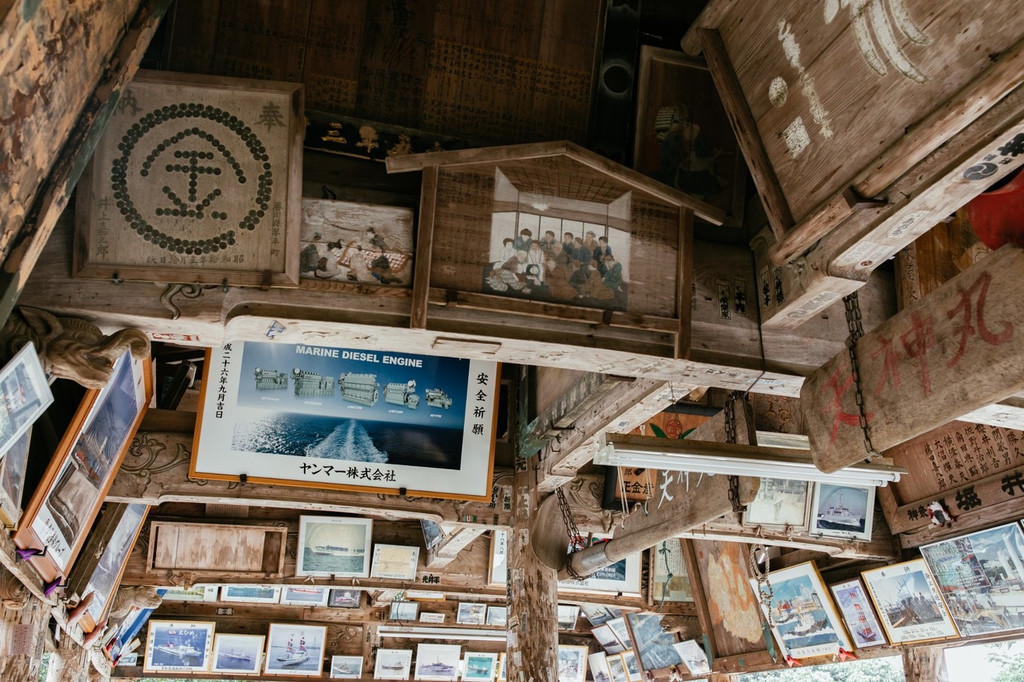 离本宫不远处的绘马殿里挂满了各式奇特的还愿物。由于供奉着海洋守护神,自古以来这里一直是人们祈求航行平安的圣地,一只大大的船只模型特别显眼。