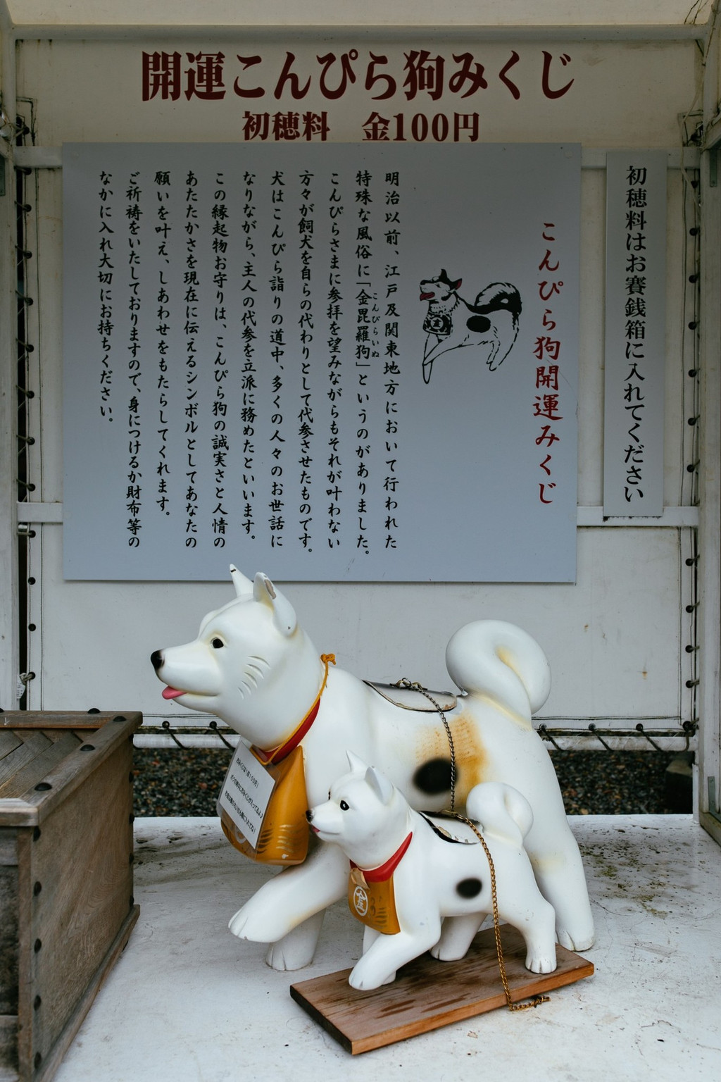 金刀比罗宫有“参拜犬”的传说:江户时代,因为金刀比罗宫非常遥远,老人或者腿脚不便的人就拜托家中的狗代替他们前来参拜,在狗的脖子上挂上包袱,里面放置“盘缠”以及主人资料,让远行的朝拜者一个一个接力将狗带到金刀比罗宫。