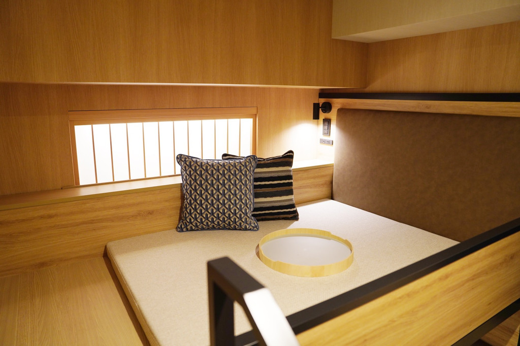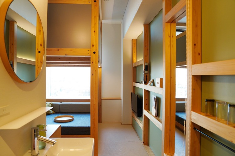 以日本传统工艺橹为灵感设计的YAGURA房,19平米的空间,绝对麻雀虽小五脏俱全!高架床分割出会客区和睡眠区,哪怕四个人住都会觉得很自在。墙上用木材拼组设计成收纳及摆饰空间,坐在房间里可以眺望窗外的美妙风景,倚靠在宽大的沙发上,享受着东京旅行的曼妙时刻。