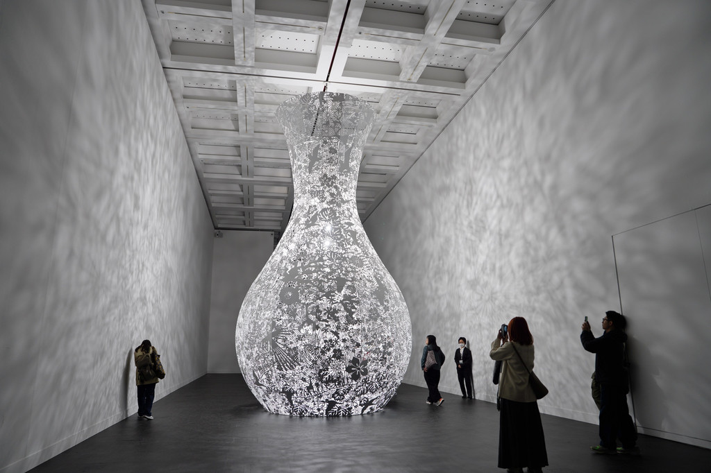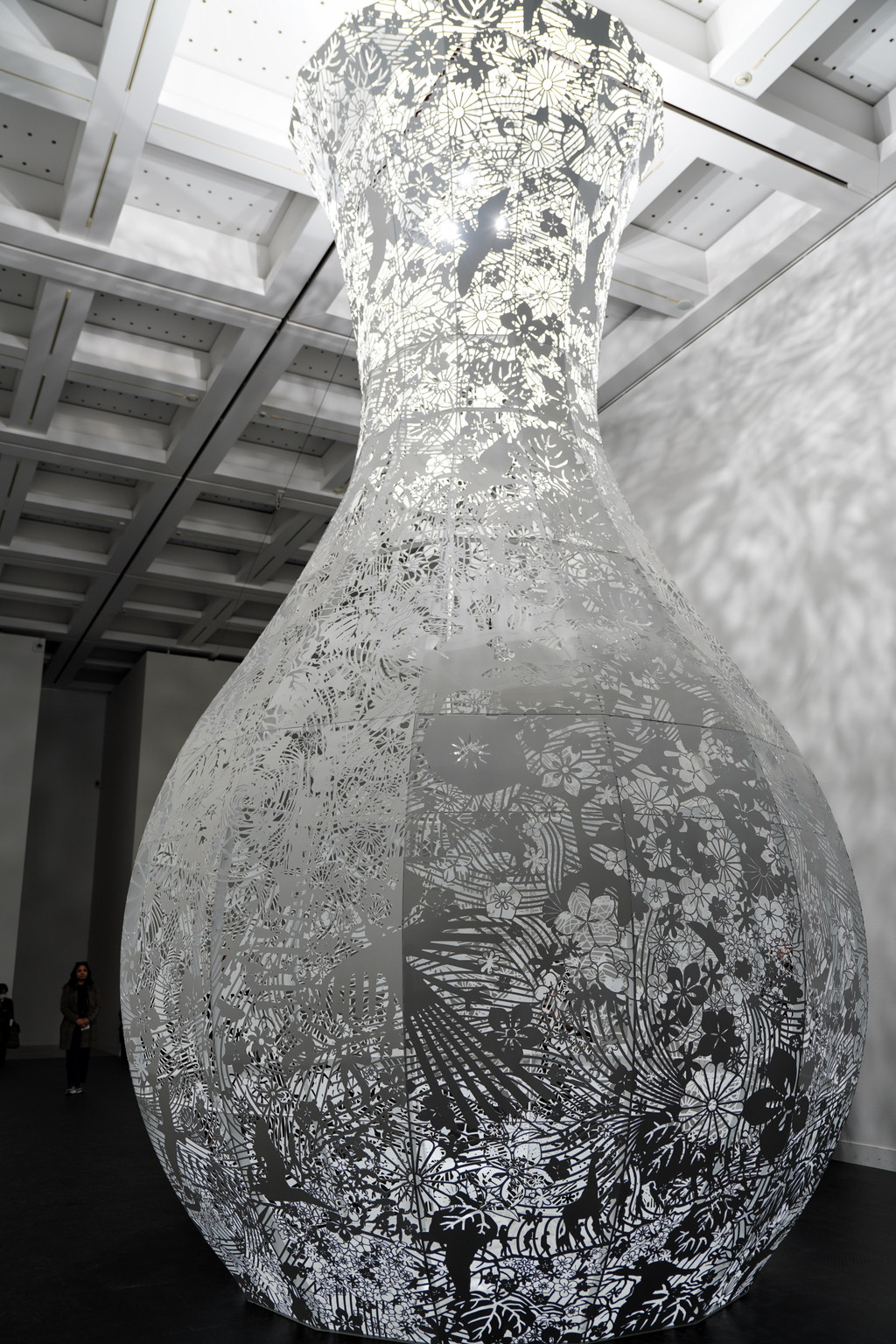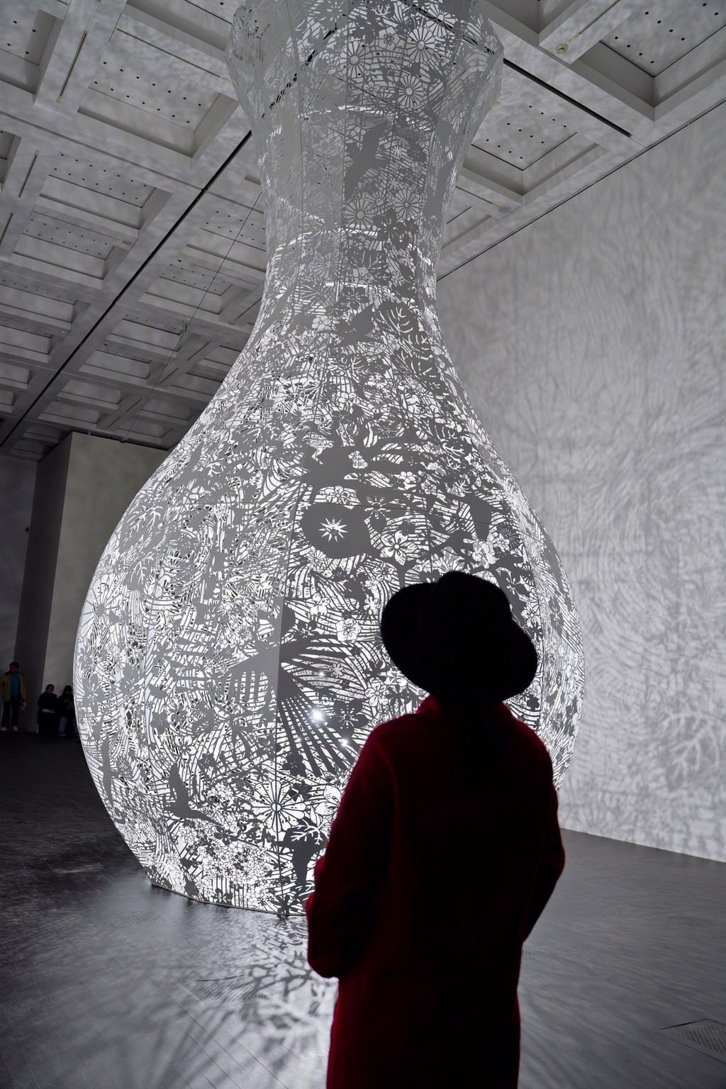 其中一个作品是高7米,直径4米的巨大镂空花瓶,瓶身由金属做成,上面用激光雕刻出植物和动物,瓶子中心有一个可以上下移动明暗变化的灯光装置,光线透过镂空的图案在空间中明暗交替,仿佛光影在呼吸。