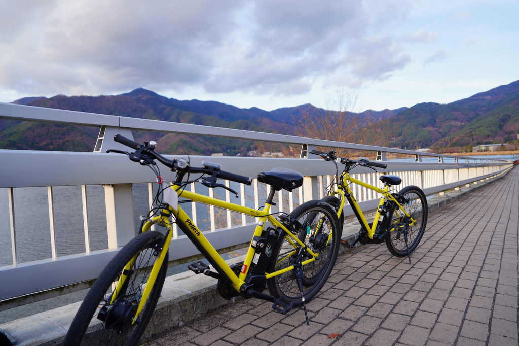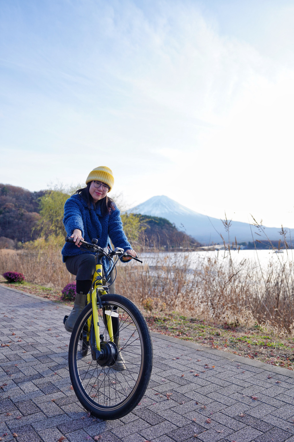 推荐在河口湖车站附近租自行车,因为富士山的几个经典打卡点距离较远,徒步几乎无法一日完成,我们是在附近的一个Cafe&Bike的咖啡馆租的,租车类型包括:普通自行车、小型电动自行车、电动助力自行车、儿童电助力自行车,推荐务必租黄色的电动助力自行车,简直不要太省力,上坡都很享受其中!我们租到晚上8点,3000/辆,无需押金。