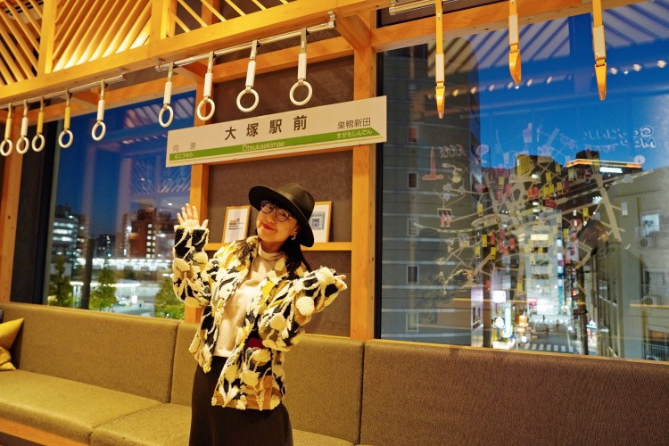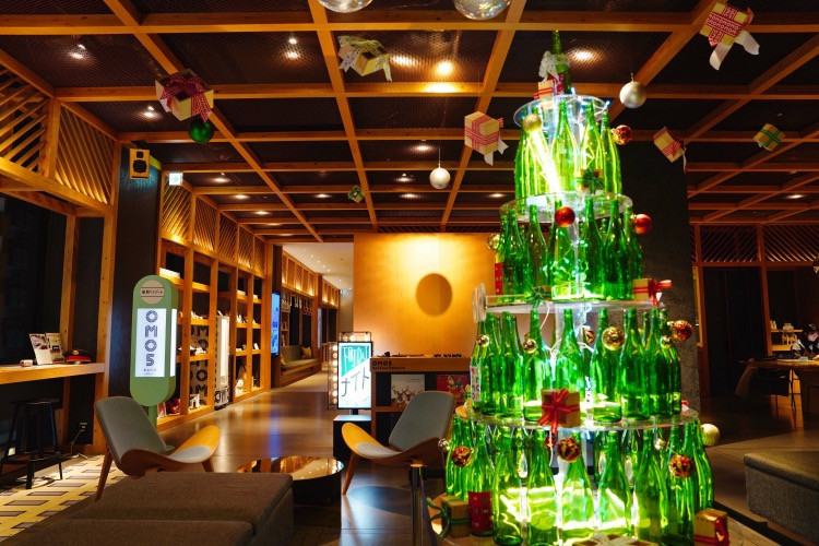 公共空间设计更是让人耳目一新,原木风格充满治愈力!很多角落值得打卡,比如模拟大塚站前的火车空间,还有酒瓶堆砌的圣诞树,无论坐在哪个角落,都感觉舒服松弛。超大幅的GO KINJO Map,这里标注着OMO5附近有趣的店铺,推荐去探索哦!