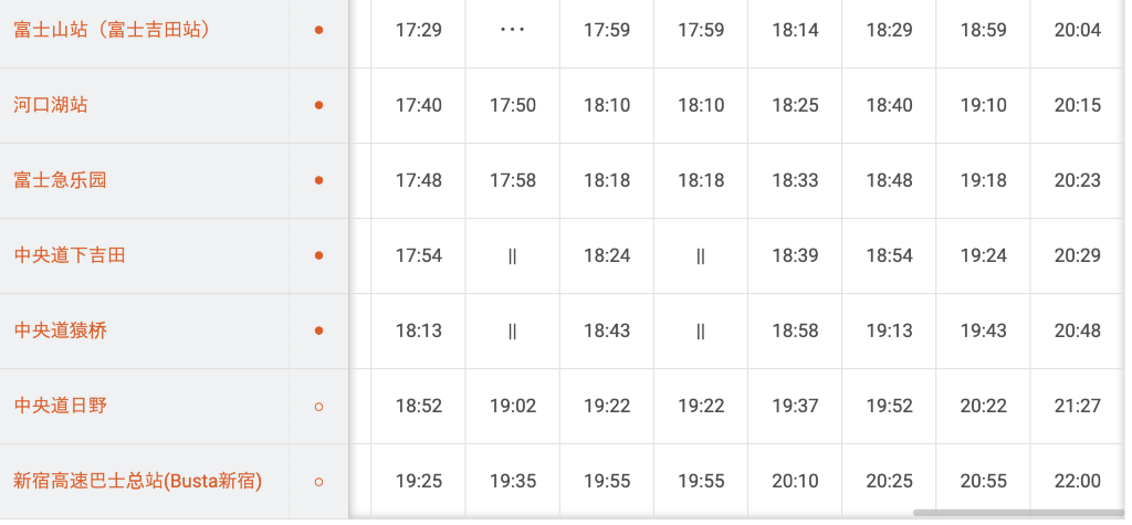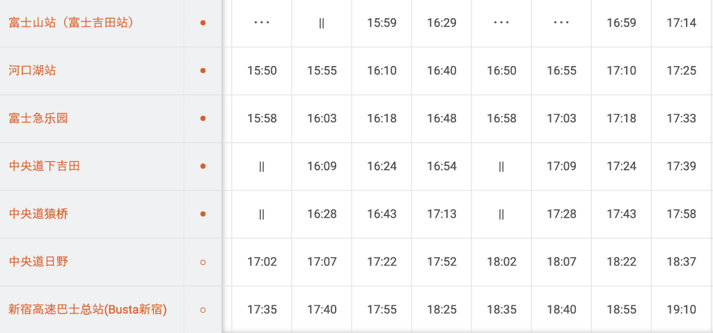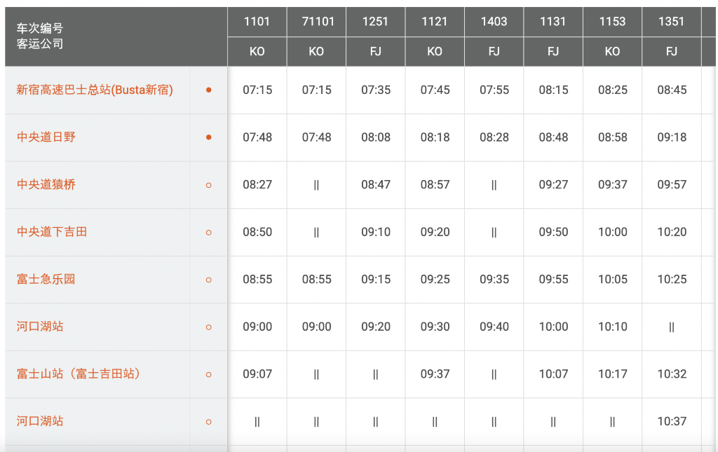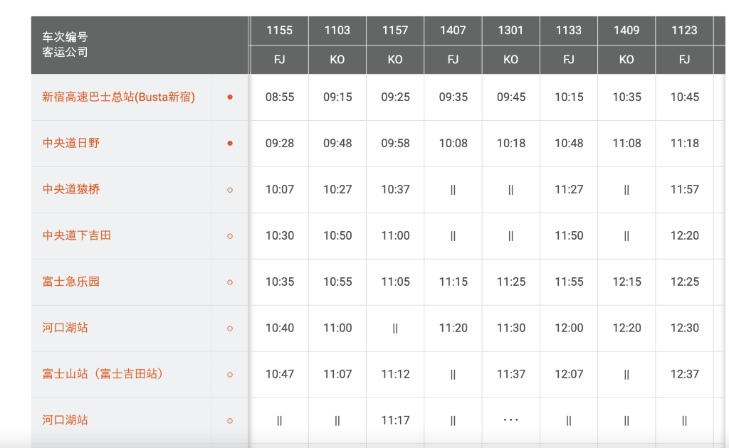 比较方便且相对性价比高的方式就是从新宿高速巴士站坐巴士前往,建议提前网上highwaybus.com预定车票,否则旺季可能抵达巴士站之后没法及时出发,甚至可能当天都没有座位。网上购票需要用VISA卡支付,预定成功会收到电子票,不用打印,上车检查电子票。推荐新宿—河口湖站,车程1小时45分钟,成人票价2200日元,儿童票价1100日元,很多巴士上还有卫生间。每天7:15开始,