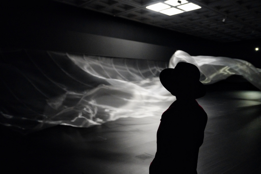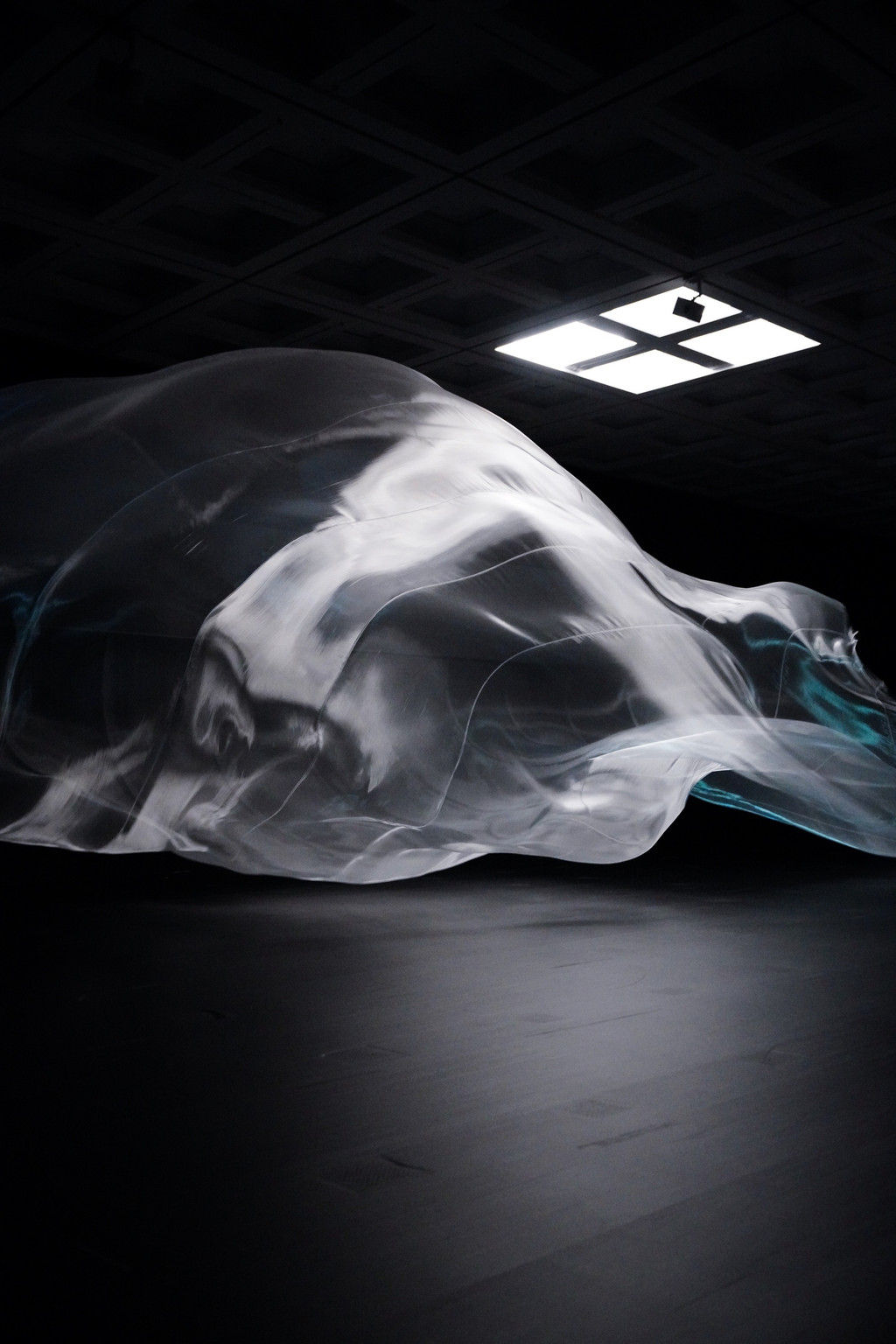 另一个作品是在一个黑暗的空间里,柔软的纤维在空中飘浮,让人仿佛置身于梦境之中。人工控制的气流,让纤维随风摆动,反射出柔媚而灵动的光泽,照片和视频无法呈现这件艺术品的震撼和美,只有置身现场,才能感受刹那间的临界之美。
