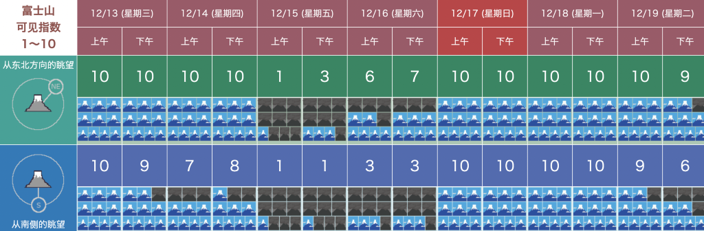 记得提前搜索查看“富士见予报”,可以查看最近7天的富士山可见指数,指数越大能看到富士山的可能性越高,每天下午16点左右更新。