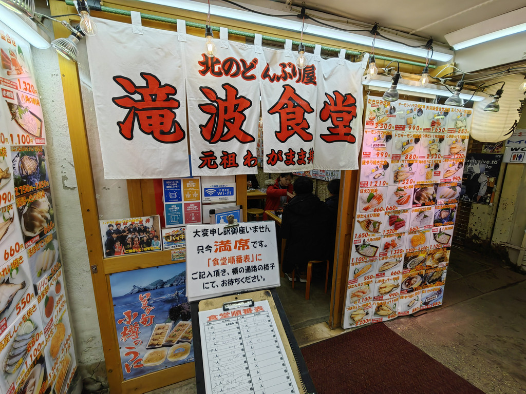 半个小时多点到达小樽站,开始拍照吧!你也会发现很多年轻人自由行来打卡。走出火车站,对面就是公交车站,记住:下午坐车到天狗山就在这里。不过现在不去公交站,你扭头转向另一头——三角市场,去吃海鲜盖饭去。铁爪子带好,摔出个事来就不好玩了。