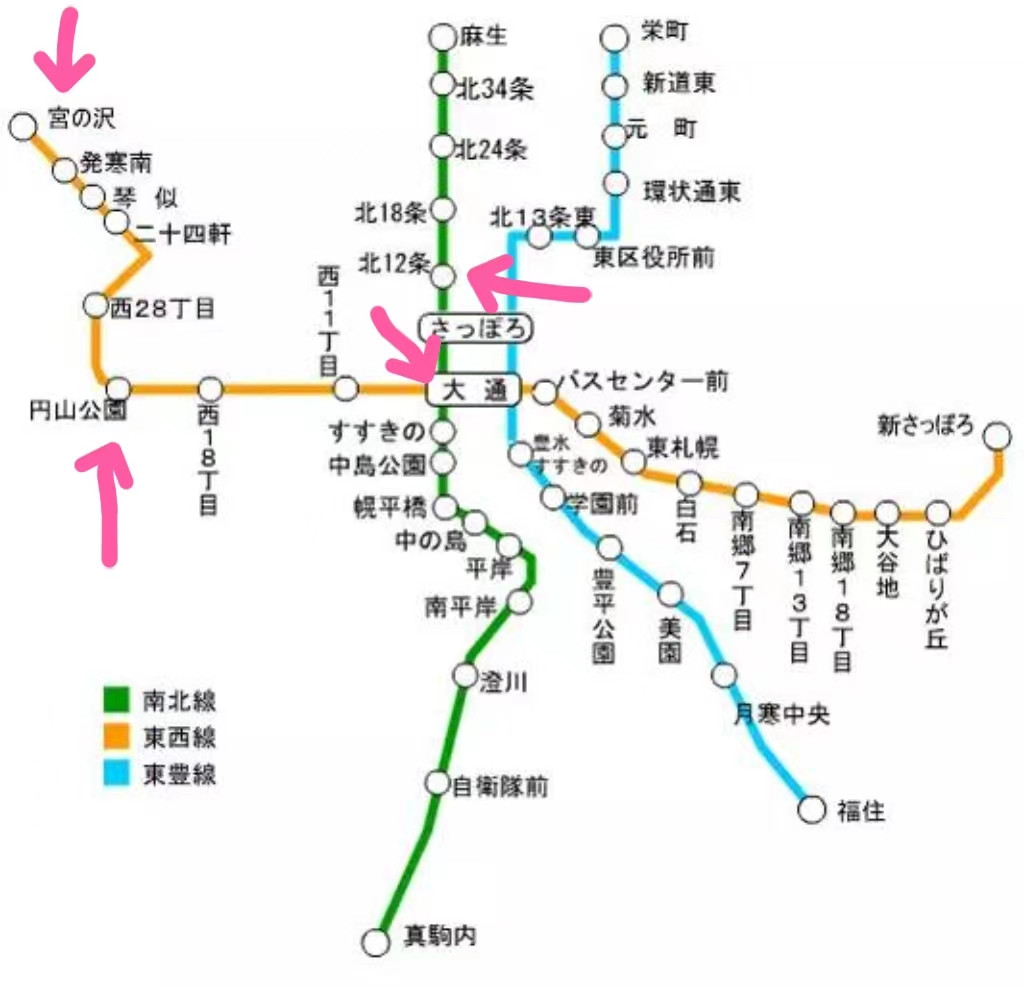 今天是乘坐地铁的一天,基本与国内的地铁差不多的意思,只是没有什么安检之类的。了解一下札幌的地铁情况,札幌地铁总共只有3条线,东西线、南北线、东丰线,这3条线在大通有交汇,也就是说在大通这个地方可以乘这3条线的任意一条,因此在大通看见地铁站,要看看清楚是那条线的。好在我们每天晚上到狸小路方向,总是经过大通站的。这里用到的App就是地图,你试试那个地图App好一些,主要是查看地铁出口到景点的线路,最好是在酒店网络比较好,查看好线路,截屏下来,做到心中有数。