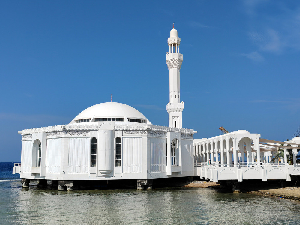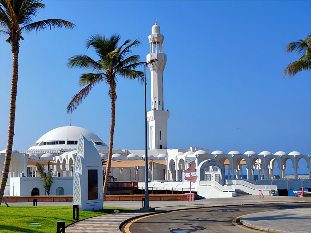 沙特时间10:00,说话间,团队首先来到于上世纪1985年建立的吉达拉赫玛海上清真寺(Al Rahma Mosque)瞻仰。该清真寺也被称为法蒂玛扎赫拉清真寺;又被称为“飘浮的清真寺”,整座建筑十分独特地建在红海上一堆白色混凝土的上面,这也是世界上第一个在水上建造的清真寺。