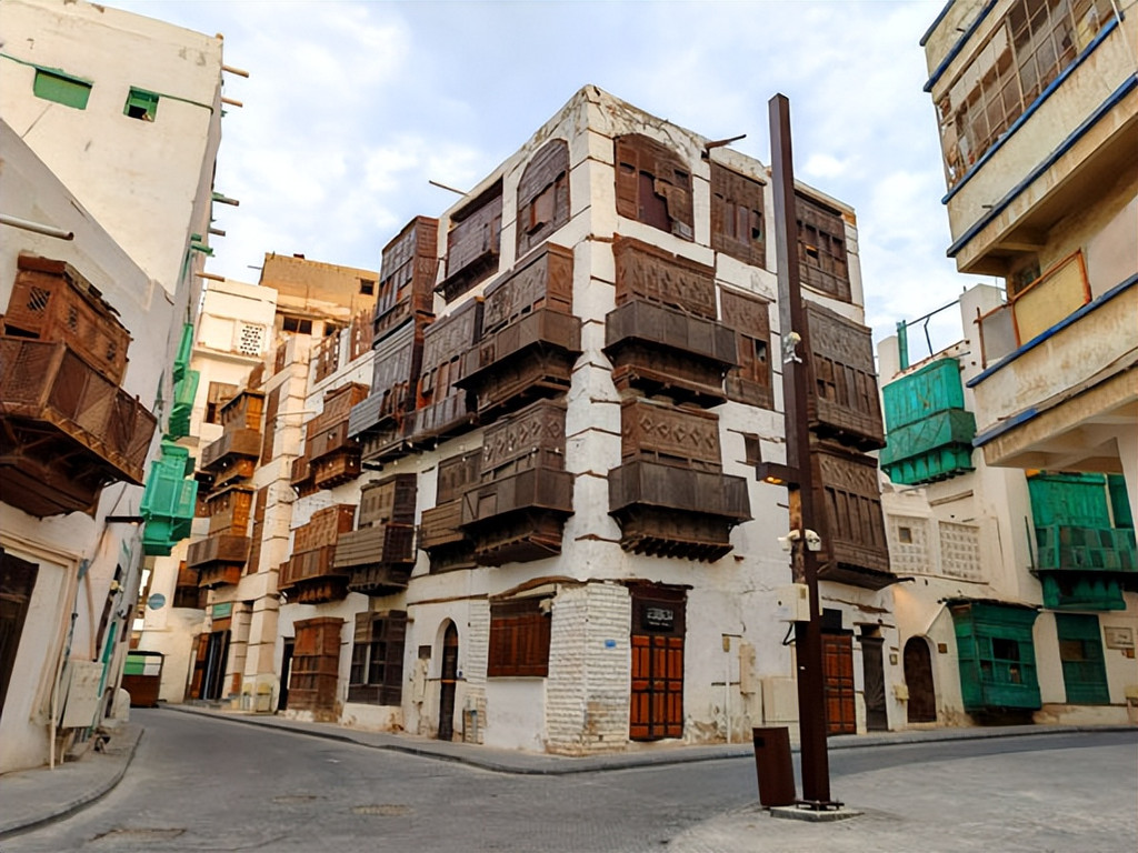 只见吉达老城区的楼房一般为三、四层高、平顶,正门上部呈拱形或者尖拱形,门户则用木材制成,上面雕有沙特传统图案;建筑物外墙绝大部分涂成白色。