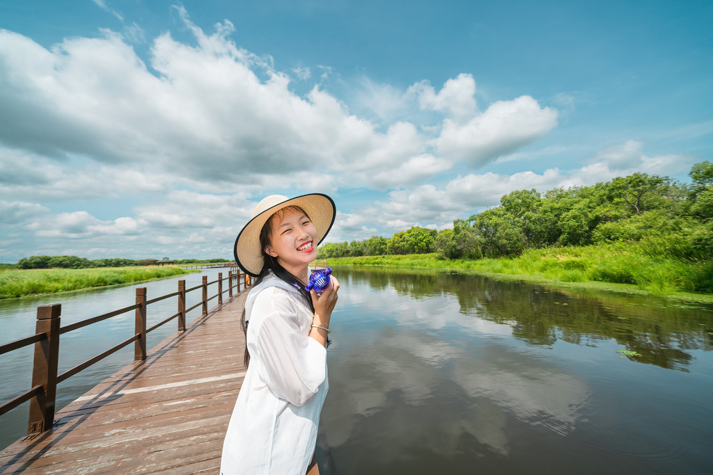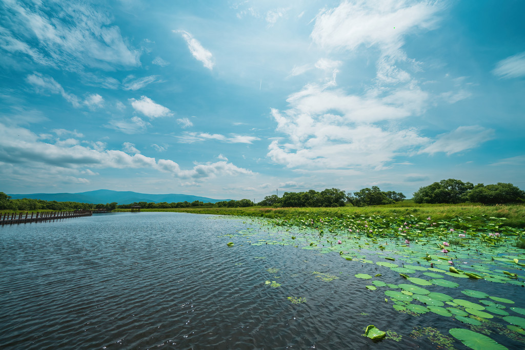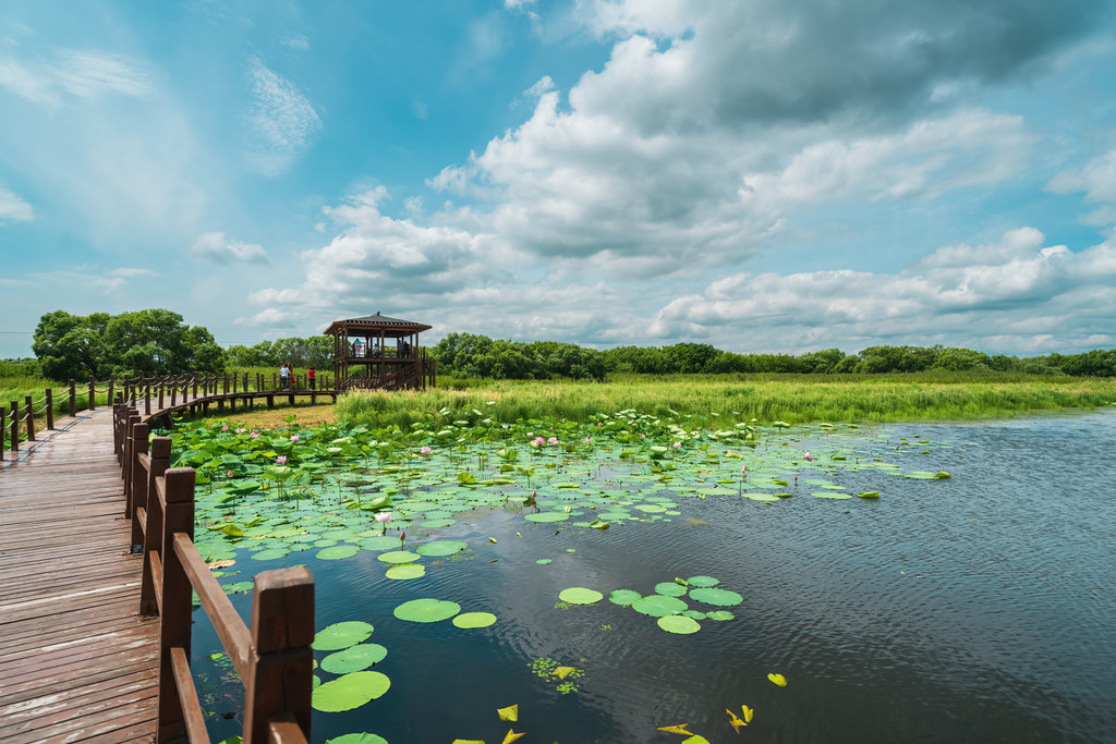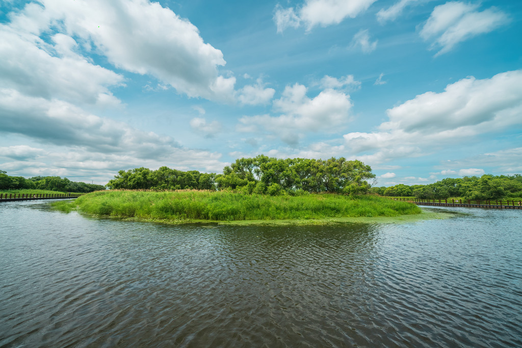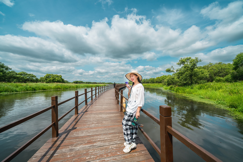 游览湿地必须走通岛浮桥。湿地与植被相映成趣,七月中旬,这里正盛开着片片荷花,天空白云悠悠,一切都是大自然的馈赠。