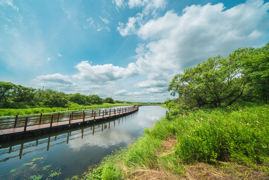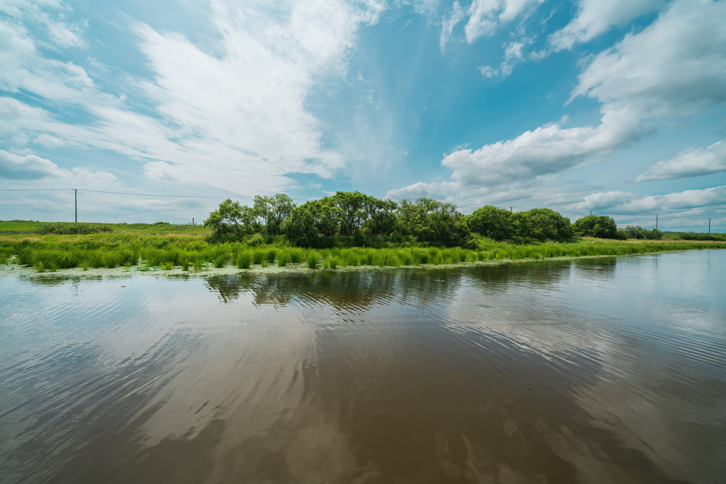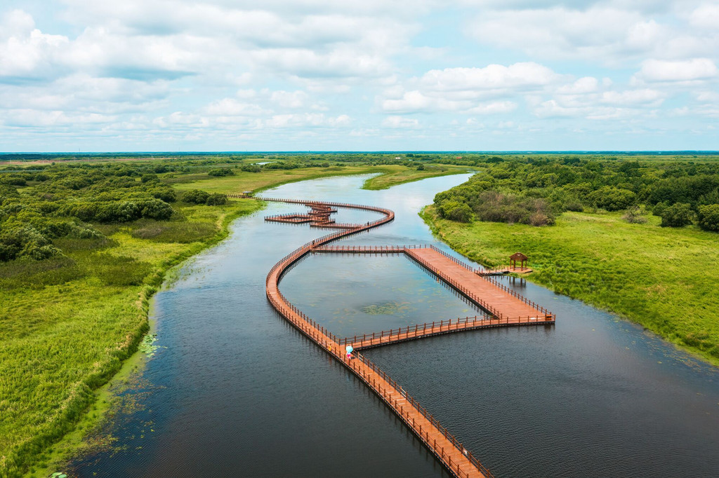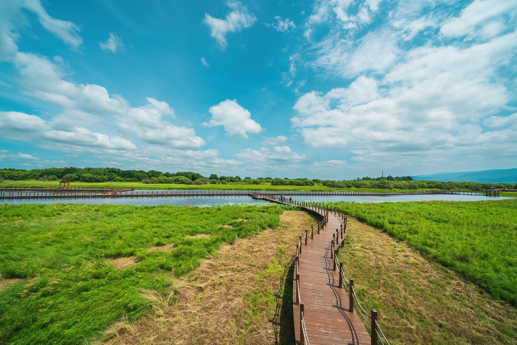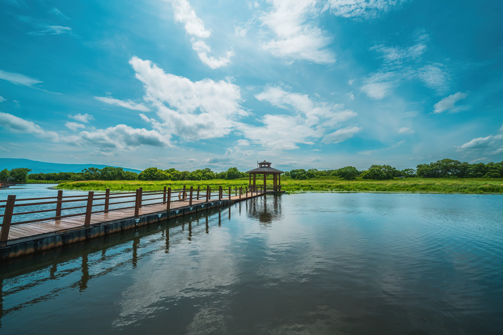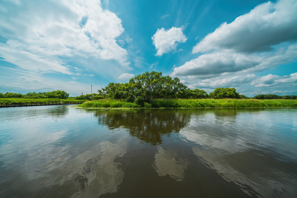 游览湿地必须走通岛浮桥。湿地与植被相映成趣,七月中旬,这里正盛开着片片荷花,天空白云悠悠,一切都是大自然的馈赠。
