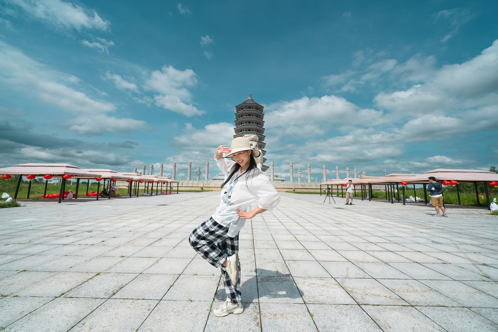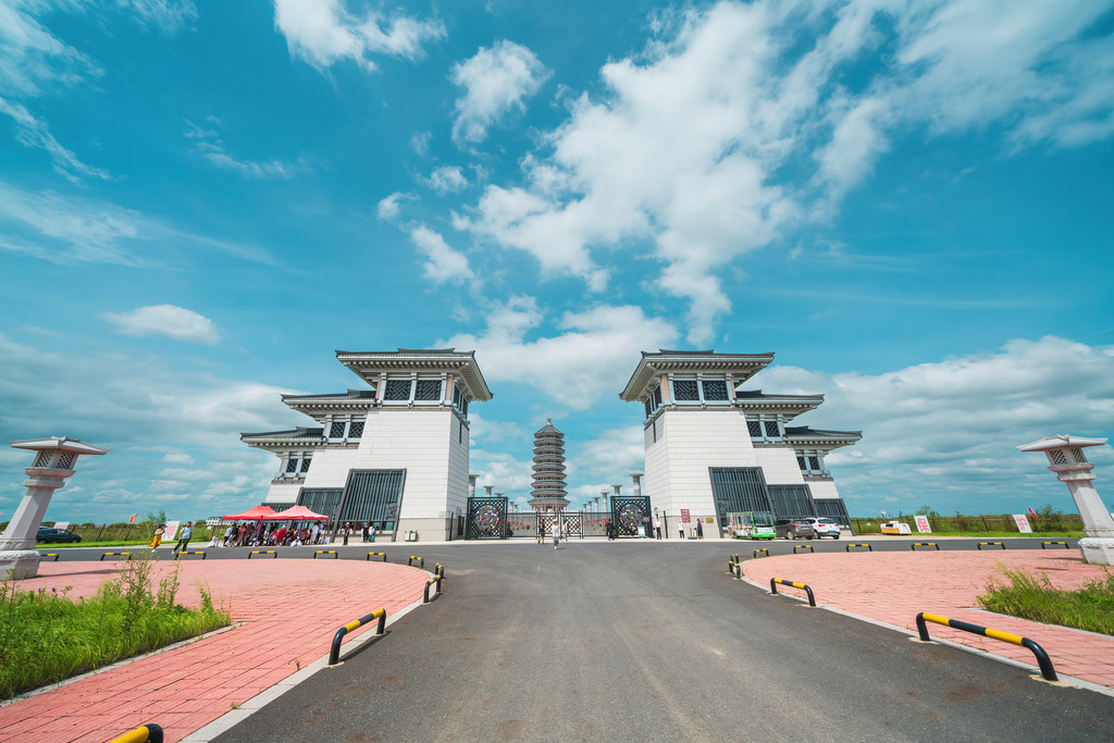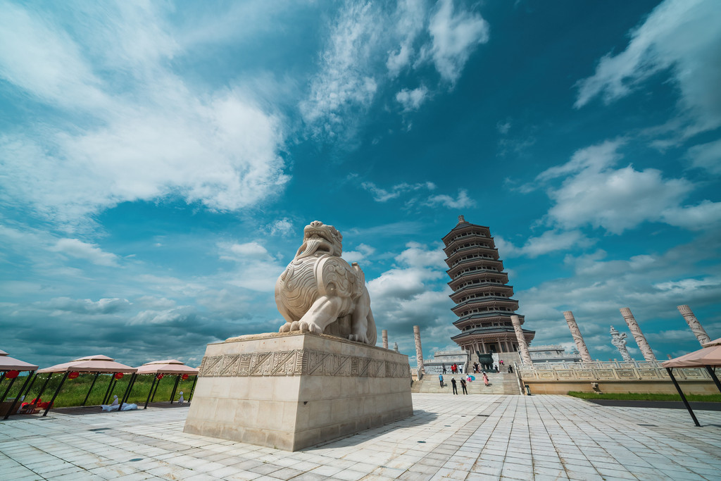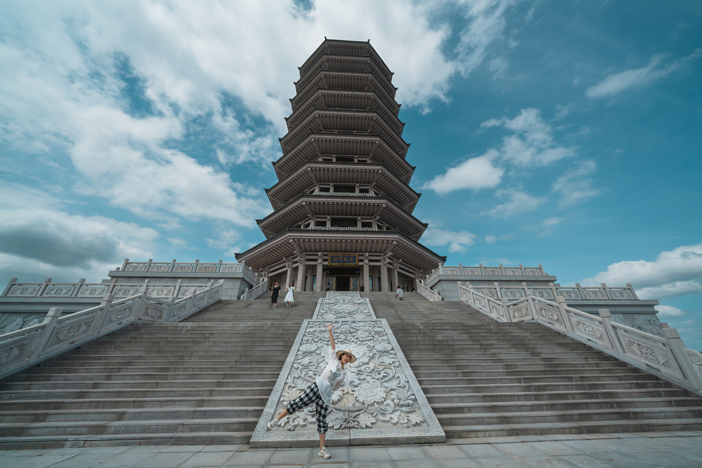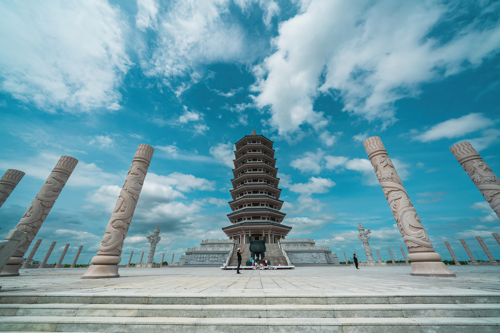 东极宝塔,为宝塔采用八角形塔身,汉唐风格,塔高9层81米6度收分,塔基座为40米×40米方形,两层叠起。