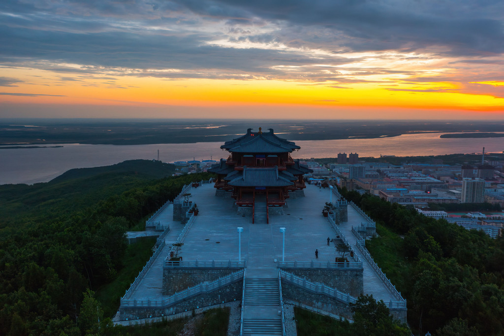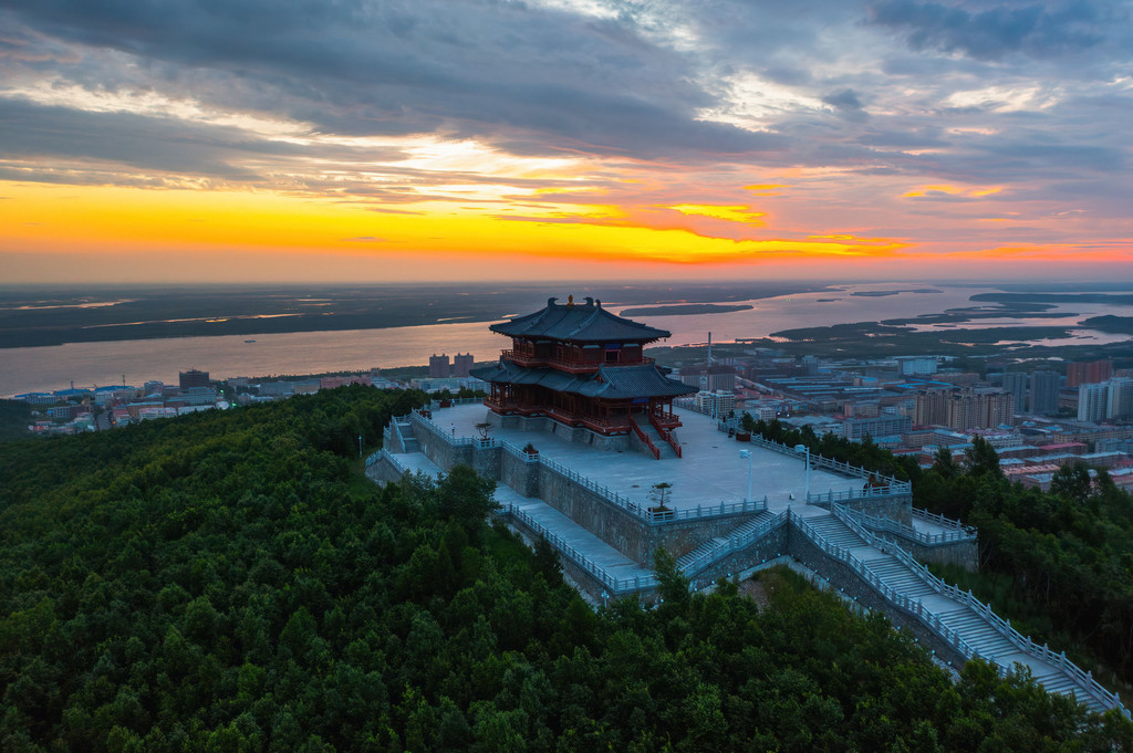 东极阁位于抚远市南山公园之巅,海拔266.5米,是抚远市的最高点。驱车可至山下,沿山路走二公里左右,即可到达山顶。