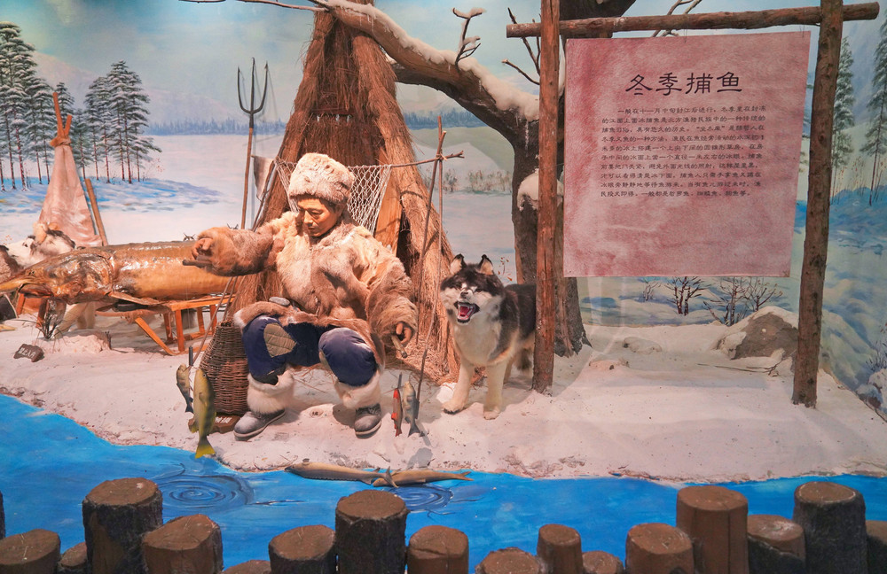 当我还在感叹赫哲族人心灵手巧的时候,展馆里一角的仿真实景造像又引领我看到了更有趣的赫哲族文化。他们除了善于制作鱼皮画、鱼鳞画,还精通铜版画、桦皮贴画、木雕等。在他们的日常生活中还会佩戴香包,更有划快马子、鱼王角力等竞技类体育项目。展馆的最后一部分,还展示了赫哲族的婚嫁过程。通过一件件展品,发现赫哲族背后的故事,显得妙趣无穷。