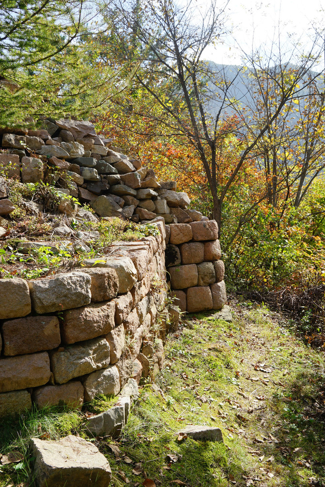 长白山上绵延的外城,叫丸都山城,看上去如同内地的长城,只是它全用山石垒砌。