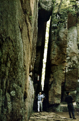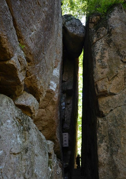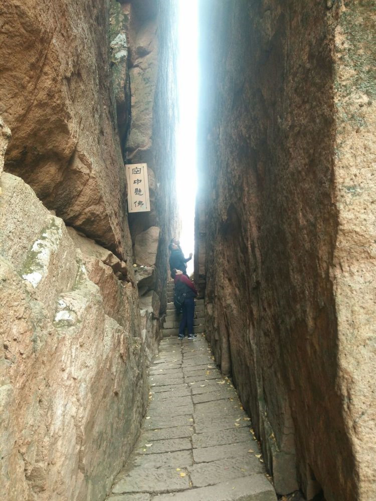 过了洞天皓月就到了一线天。一线天:高38米,长28米,宽1.15米,最低处0.8米左右。南北平直贯通,两侧石壁垂直平滑,非常壮观,撼人心魄,据专家讲,这个—线天的状貌,在国内独一无二,堪称一绝,为我国10大著名—线天之—。站在石缝下朝天仰望,有十足的神奇感这就是传说中佛徒三掌扣开的天关.大石缝。