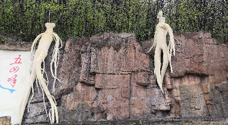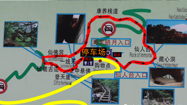 从大门从坐游览车不约五分钟到达洞天皓月景区停车场,然后沿着一线天方向开始登山。洞天皓月景区较小,用时约1小时左右。主要景点:一线天、登天崖、伏羲古迹、仙佛洞。五一下午下着淅淅下雨,伴着淅沥沥小雨,正是登山的好天气。