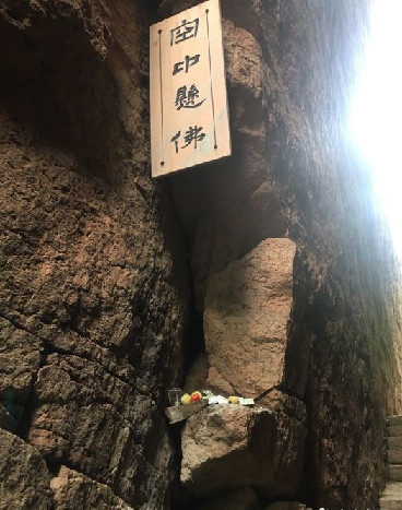 在一线天石壁上还有一个更神奇的景观,一大—小两块椭圆形石头, 形成一个有身的“大佛”形状,人们叫它“空中悬佛”"悬佛"头部五官分明,双目圆睁,牙齿外露,眼和嘴呈天然白色,神态十分逼真。其表情犹如在用力撑开两侧高大的石壁,俯视芸芸众生从此顺利通过。许多游人虔诚参拜,祈求悬佛保佑步步高升,心想事成。