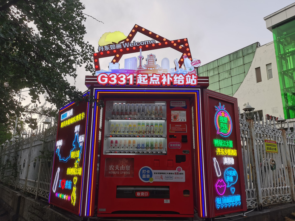 这个补给站的位置在丹东客运站附近,锦山大街和十纬路交叉路口,鸭绿江大厦东南角,买瓶水可以到旁边的鸭绿江大厦万信至格酒店前台盖纪念章,G331起点的纪念章。我们买了一瓶水,去找前台盖章,前台的小姑娘态度非常好,只要说下想盖个章,就可以直接盖章(可以不用买水),一共有3枚章,拿章给你自己盖。
