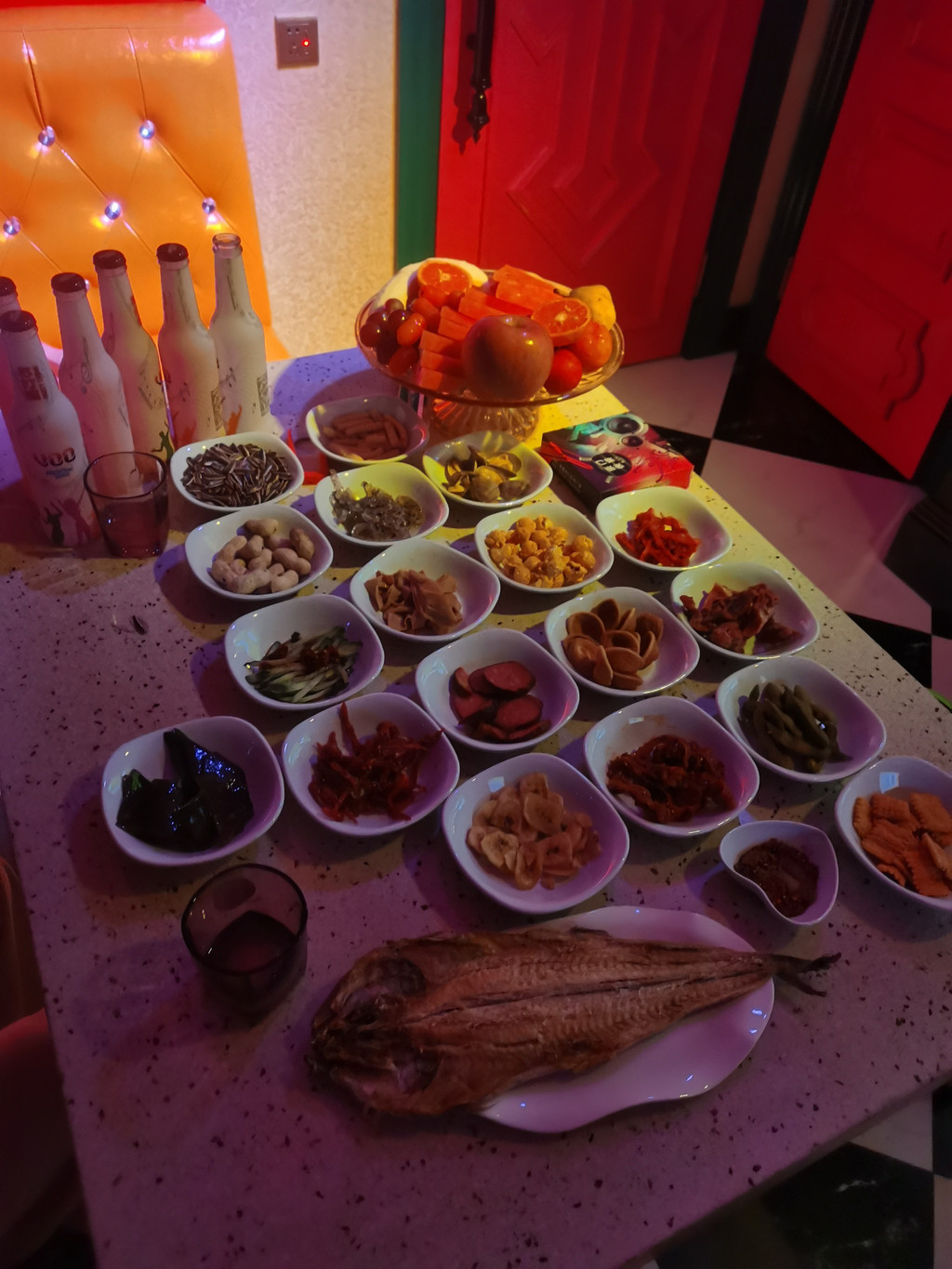 今天天气很好,非常晒,太阳底下挺热的。吃完饭,溜达回酒店接着躺。下午想去体验下东北的搓澡,打车到了评价不错的一家,到了以后,告诉我们,今天水冷,水温还没起来,泡不了澡。珲春的旅游旺季还没到,没什么人。于是,转战KTV ,找了一家客评最好的KTV ,买了个一百多的套餐,送小吃十八样+果盘+6瓶汽泡酒,3小时欢唱,又被珲春的物价震惊了。