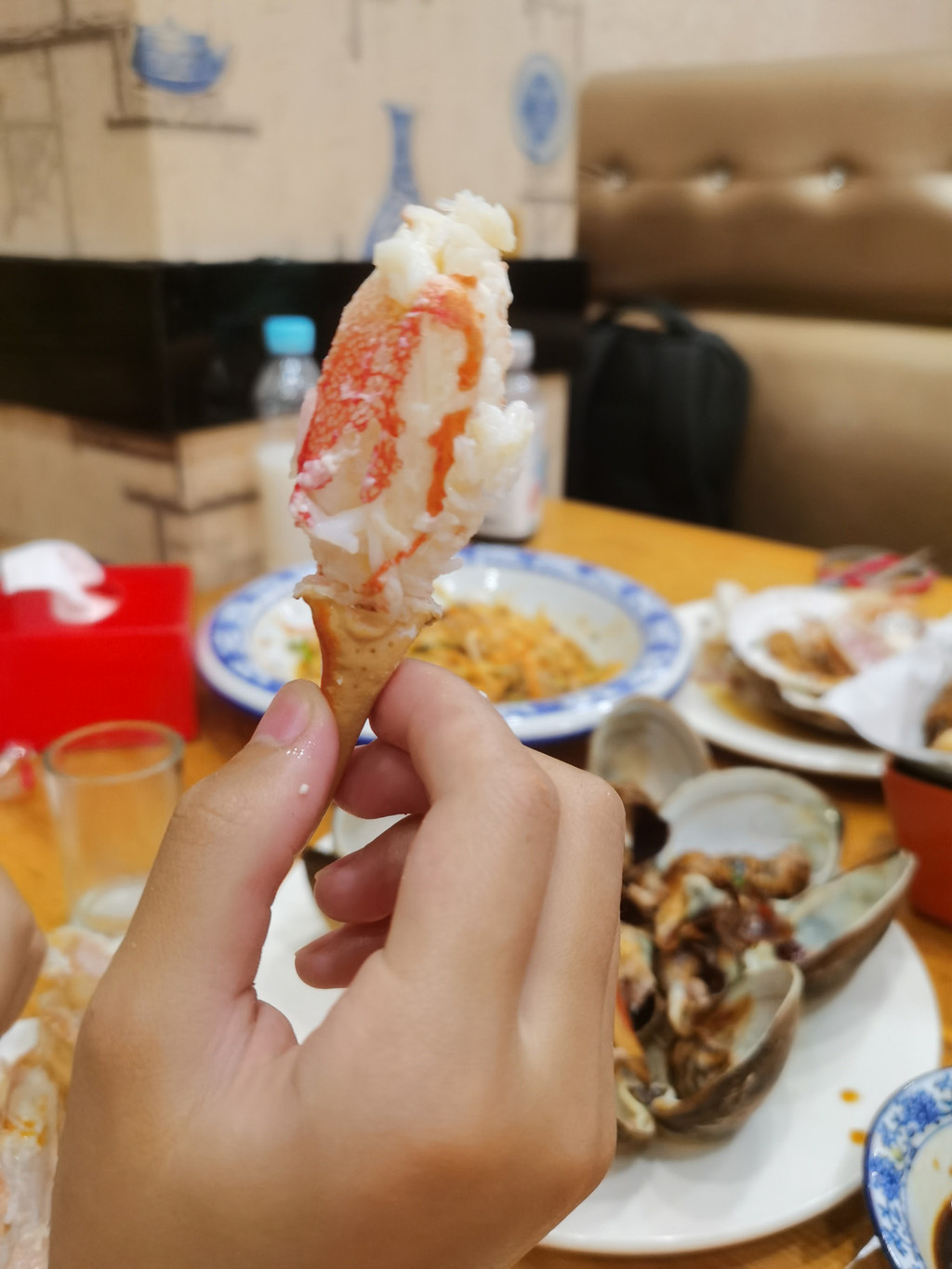 板蟹到底有多大,半个钳子比娃的手指还大,肉质饱满。本来还想第二天再尝尝帝王蟹,这只板蟹直接把我们放倒,帝王蟹更大,肯定是吃不完了。
