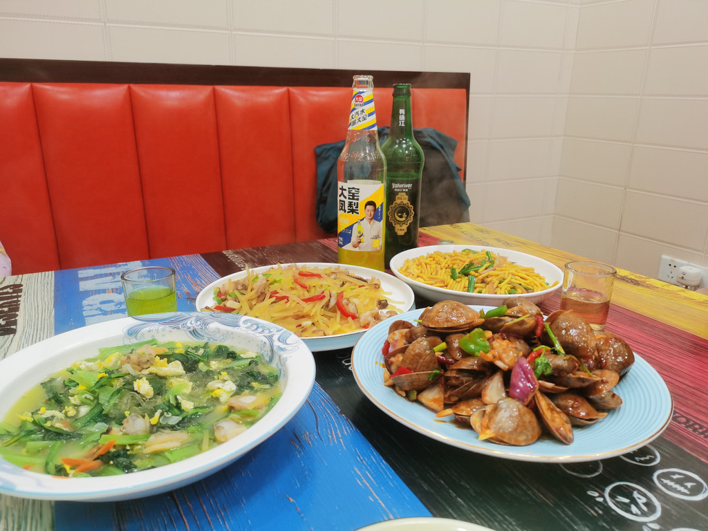 炒黄砚子、土豆炒什么螺,青菜烧什么贝壳类的,海鲜我基本都不认识,加上炒叉子,喝的啤酒饮料,人均消费60,性价比不错。