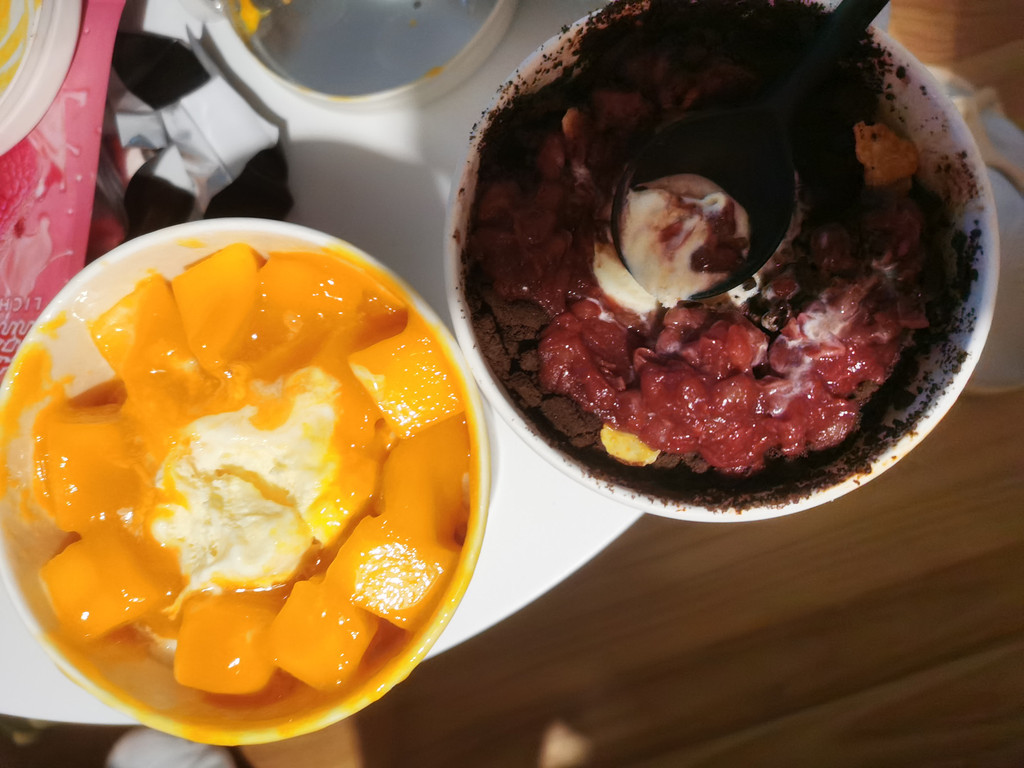 都说延边的甜品不错,延吉人多,没去排,珲春各式甜品咖啡店很多,点了网评很好的劳顶笨的芒果雪冰和咖啡雪冰(都点的小份,三十多一份),拿到外卖后震惊了,两个桶装,货多料足,一份我们三个人都吃不完,又浪费了。
