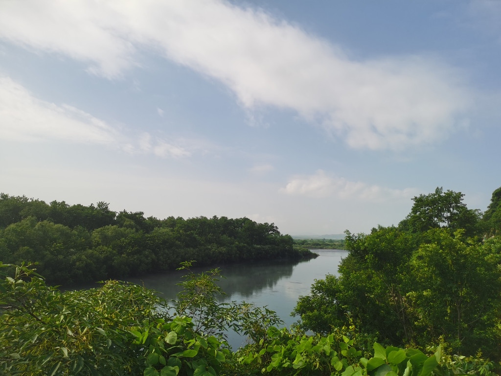 浑江水在这里几乎呈一个360度的大转弯,江水环绕着浑江村,是浑江汇入鸭绿江前最后也是最大的一个拐弯处,被称为“辽东第一湾”。这里是两国两省两江的交汇处,过了大桥,就从辽宁进入吉林了。
