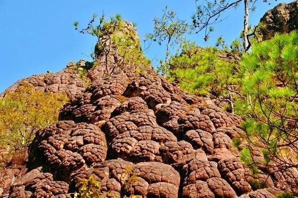 石宝山为丹霞地貌,球状风化石形成的奇峰异,石如钟、如箭、如狮、如象,高者成崖,错落有致,别具一格。中国游侠徐霞客亦曾到此,他在《游石宝山记》就说∶“石面有纹如龙鳞。”