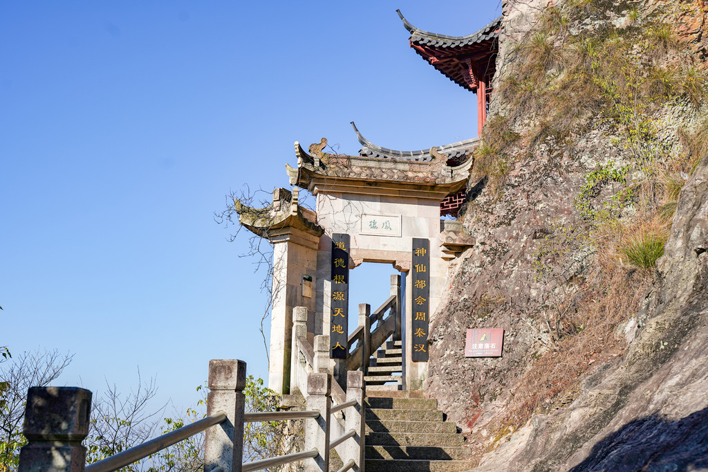 此处的悬空寺与山西恒山悬空寺有异曲同工之妙,主殿为地藏王大殿,依山而建高3米,长60米,它一半嵌入岩腹,一半悬于半空,十分壮观,立在主殿驻目望去,远处的山峦河川尽收眼底,飘飘然竟有种俯瞰天下的感觉。
