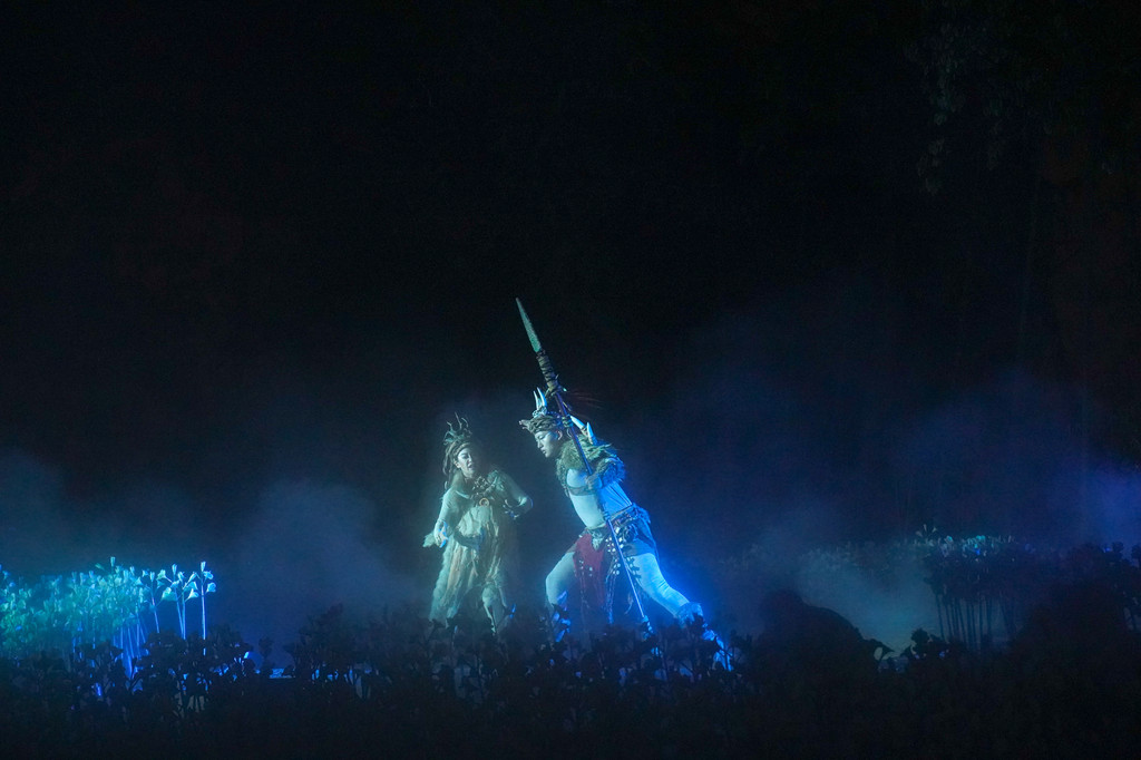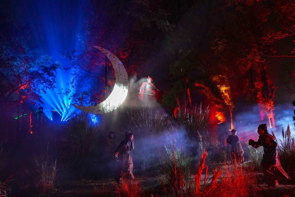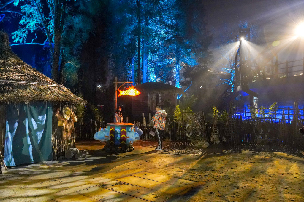 伴随着音乐响起,黑漆漆的台上亮起霓虹色的灯光,近处的草木皆被镀上一层颜色,五光十色霎时好看,正沉迷这宏大场景时,不知哪飘来一团白雾,把近处的一切吞了进去。