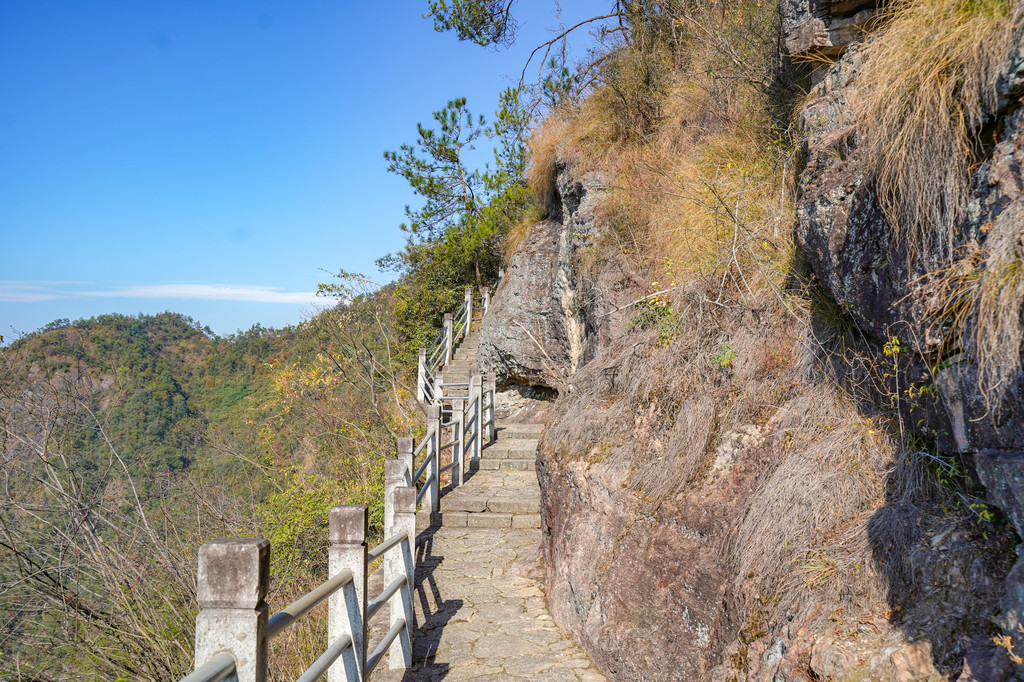 看着蜿蜒的栈道依山而建,时而隐入岩石中,时而凌驾于悬空,蜿蜒向上盘去,不止要去向哪里,只见得这望不到尽头的栈道中间有几间青砖黛瓦的寺庙,饰朱红色漆,上面勾勒简单纹样,庄严古朴,立在这峻峭山峦间,似在喃喃哪无尽的岁月。