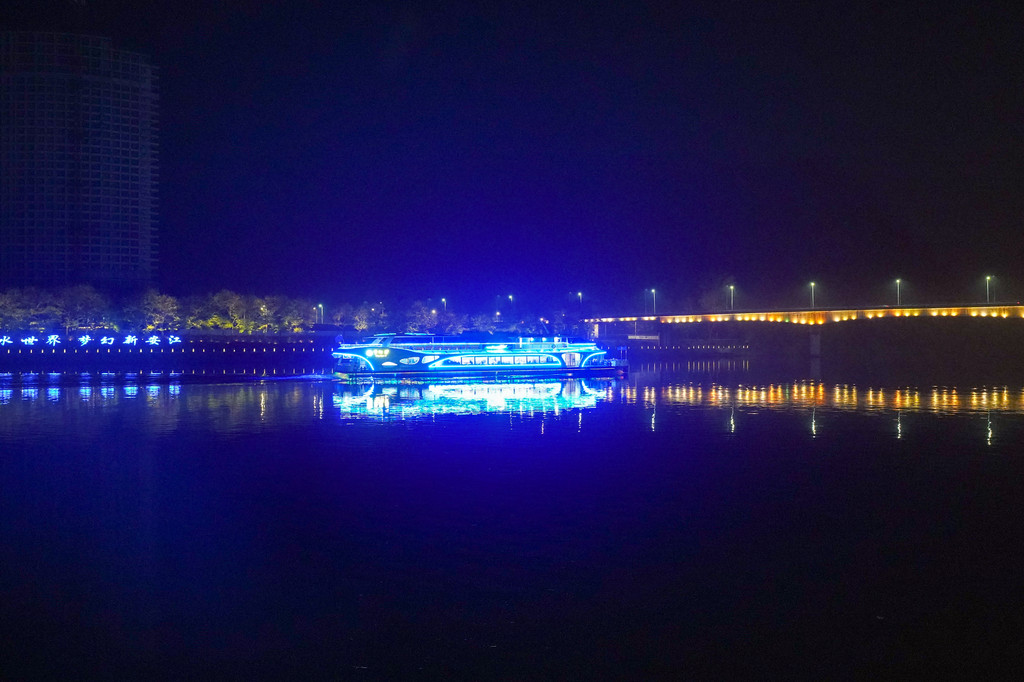 来到游船码头,天色已暗,乘坐游船前往月亮岛,一路上可欣赏到建德美轮美奂的夜景,微风清凉,享受着新安江独特的魅力。