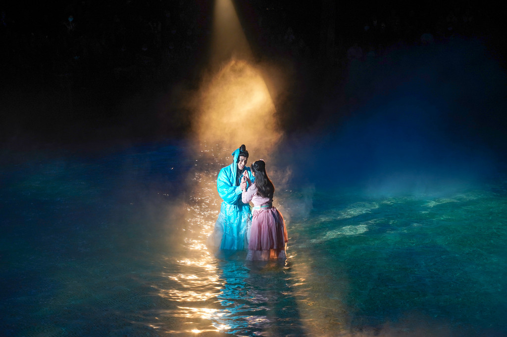 任官差、族人的暴怒和呵斥声响彻天地,此时电闪雷鸣、狂风暴雨、滔天巨浪,似乎要吞噬一切……英娘和思文在扁舟上摇摇欲坠,一段关于前世今生的歌声震撼响起。一轮圆月从水面浮起,英娘和思文从水里走进圆月,完成一段极其唯美的爱情双人舞。