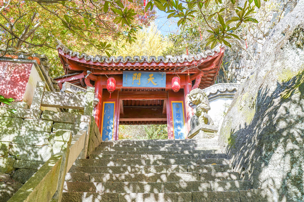 这日天朗气清,惠风和畅,下了高铁打车40分钟便到达大慈岩景区的正门,笔挺古朴的牌坊没有过分的去雕龙刻凤,胭脂色的牌身也与身后小景的蓝调前后映衬,显得格外亮眼。