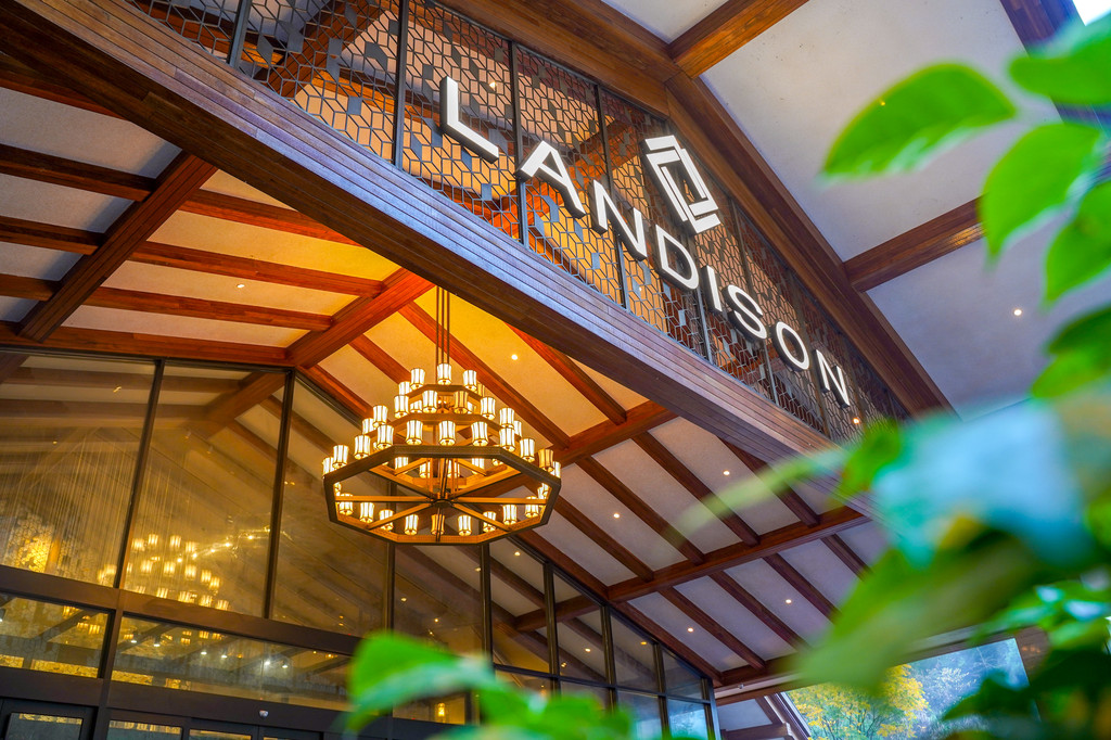 往里面继续走去便是酒店大门,只见悬梁构造的坡屋顶前面亮着由英文组成的LOGO,方正得体与后面建筑方成一体,门前有铝管弯成的山峦从水中拔地而起,映着复古的建筑样式与现代材料瑶瑶相对。
