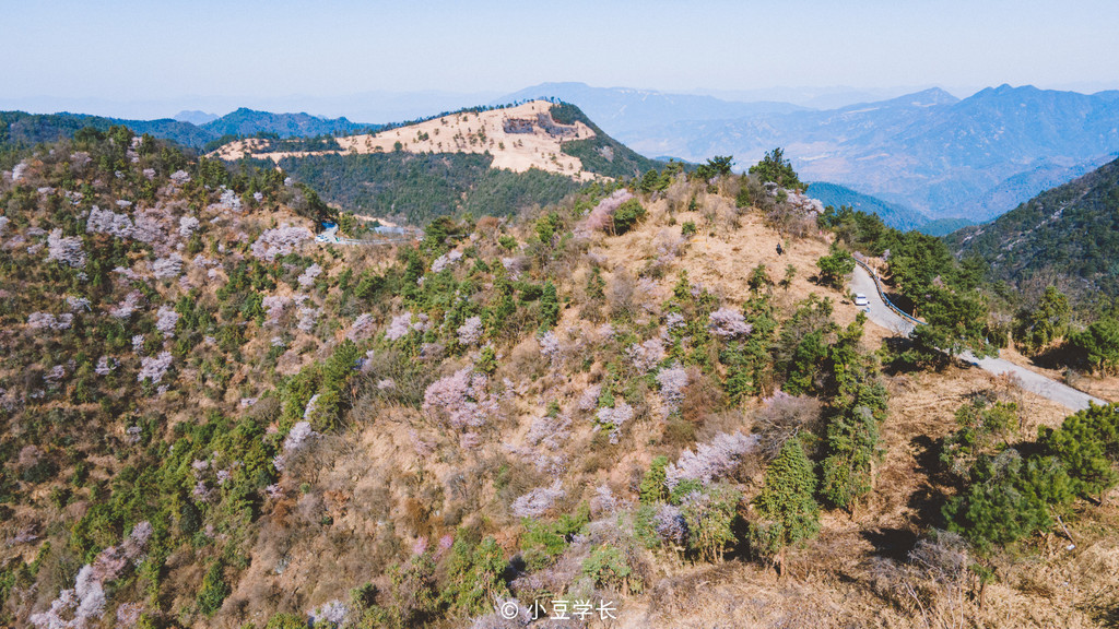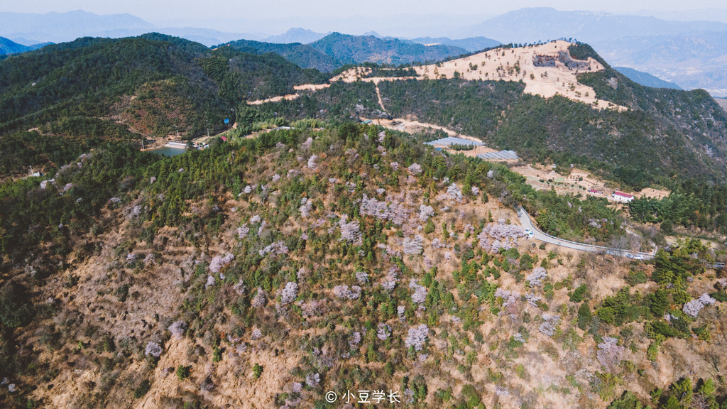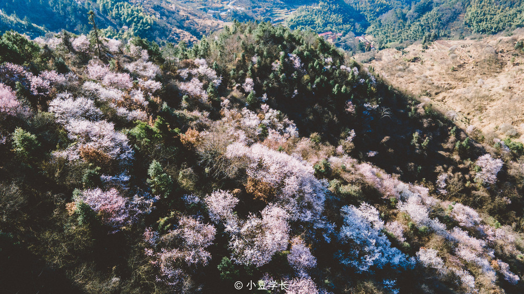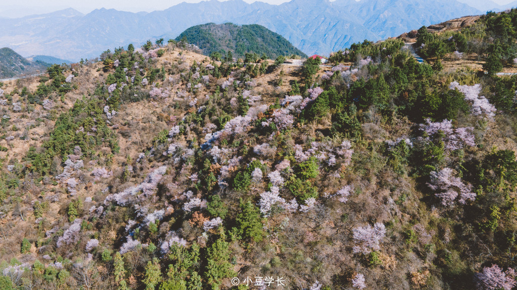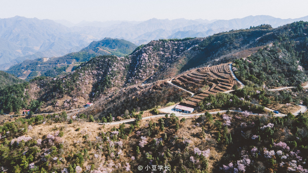 放眼眺望,一片粉一片白,铺满连绵起伏的山岭,一个山头连着一个山头,漫山遍野地开。