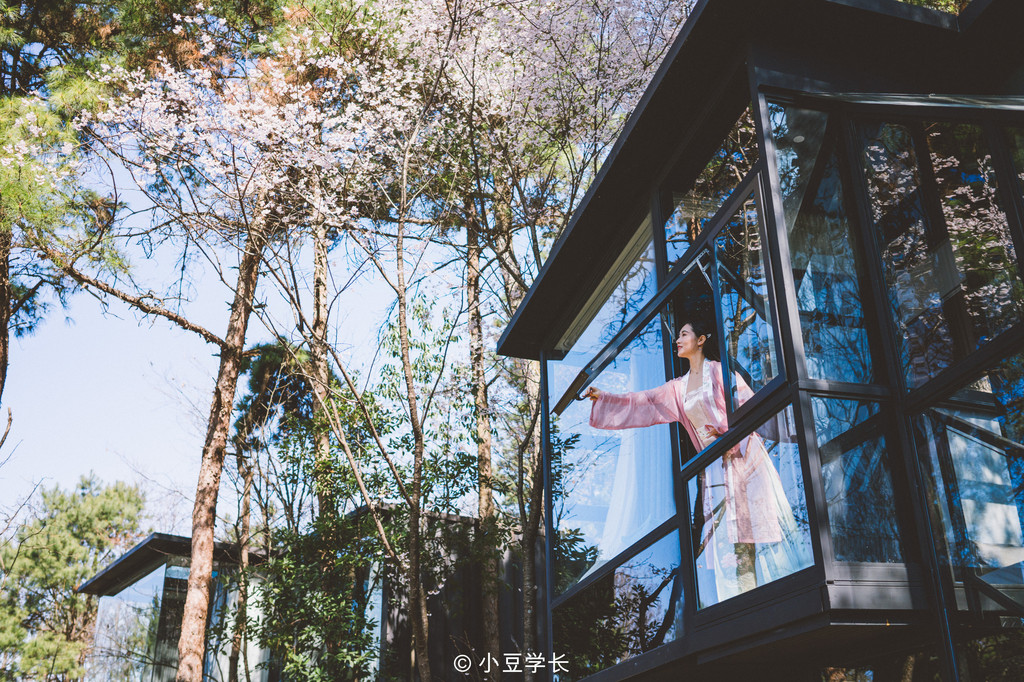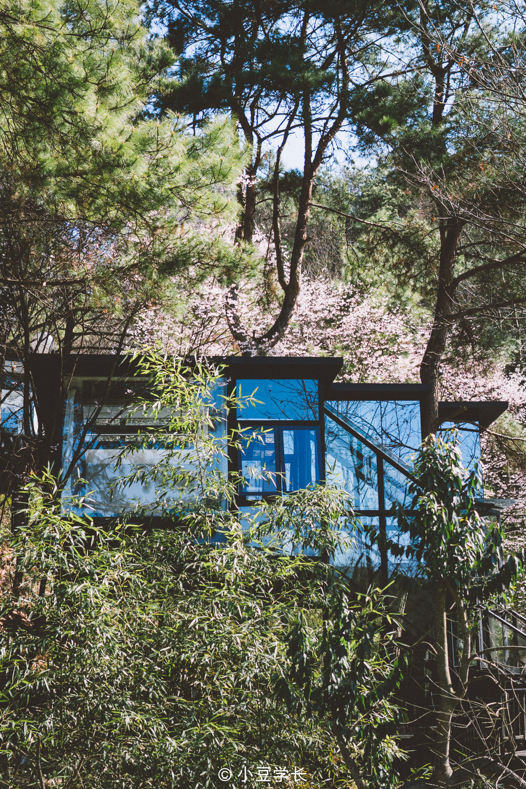 全景玻璃窗的树屋+野生樱花林,ins风的全景玻璃窗的树屋是最特别的,旁边就是野生樱花林,夜晚运气好的时候还能看到星星,躺在房间可见美好景色。