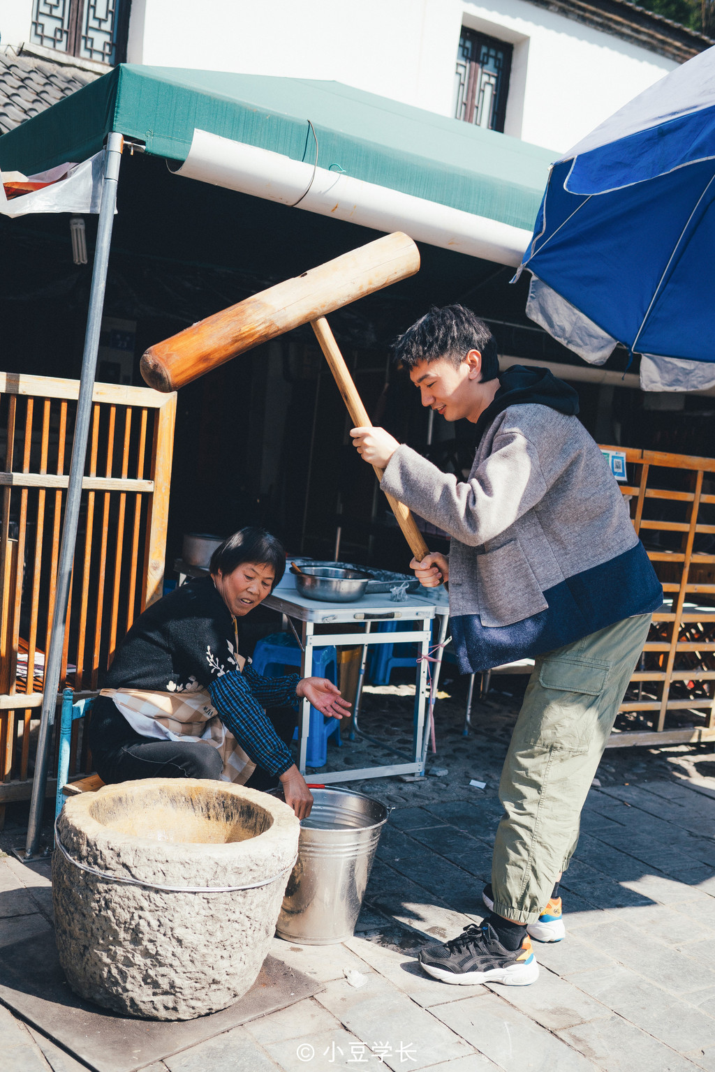趁热倒到石臼里,分工捣打、翻麻糍,全家人合作,快进快出,才能做出软糯的麻糍。这是巧活,也是力气活(一个锤子约12公斤),再包入红豆或芝麻馅。
