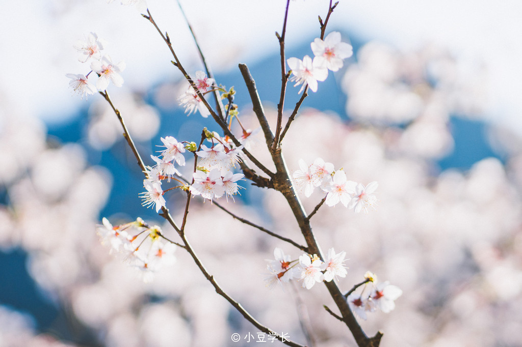 白色、淡粉色的樱花,夹杂在绿色的山林间,晴时明媚,灿若云锦,雨时娇艳,宛若仙境,美得妙不可言。
