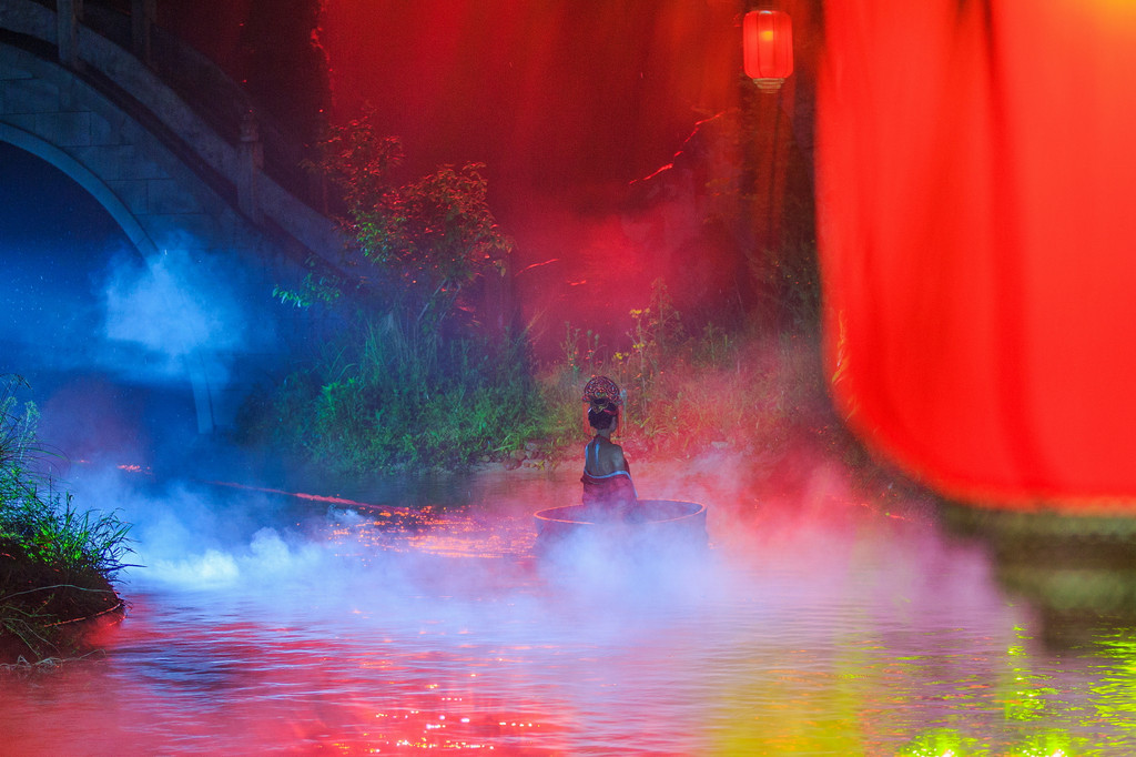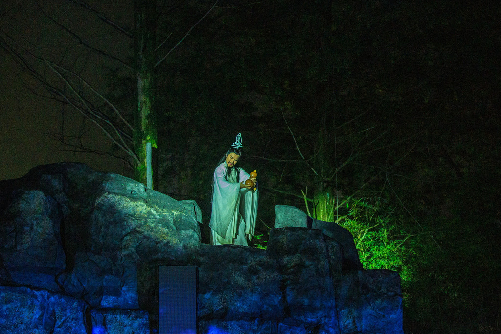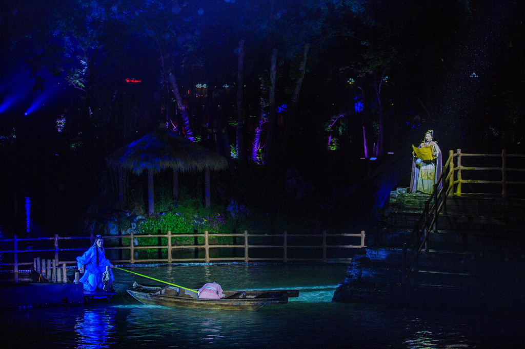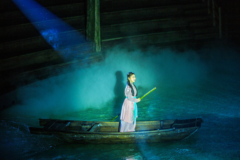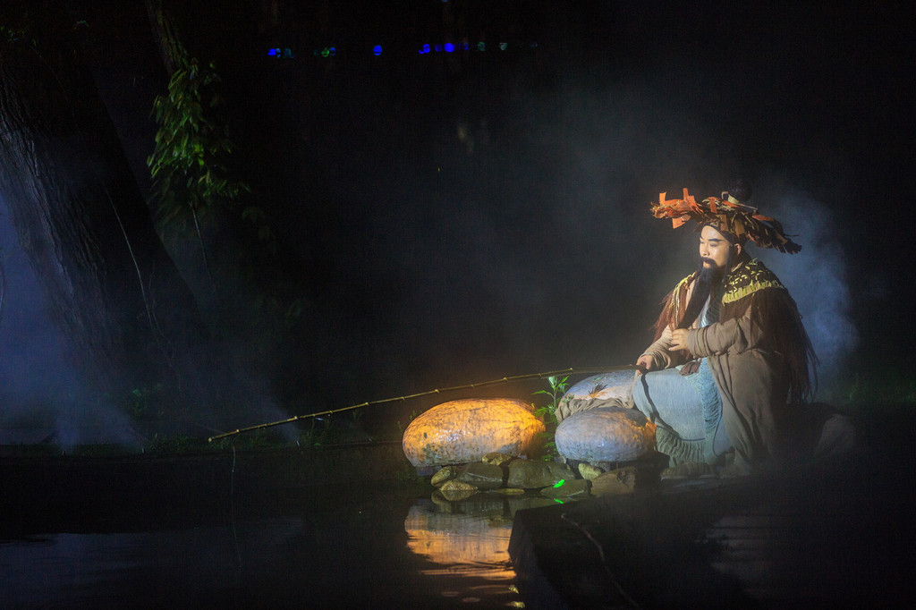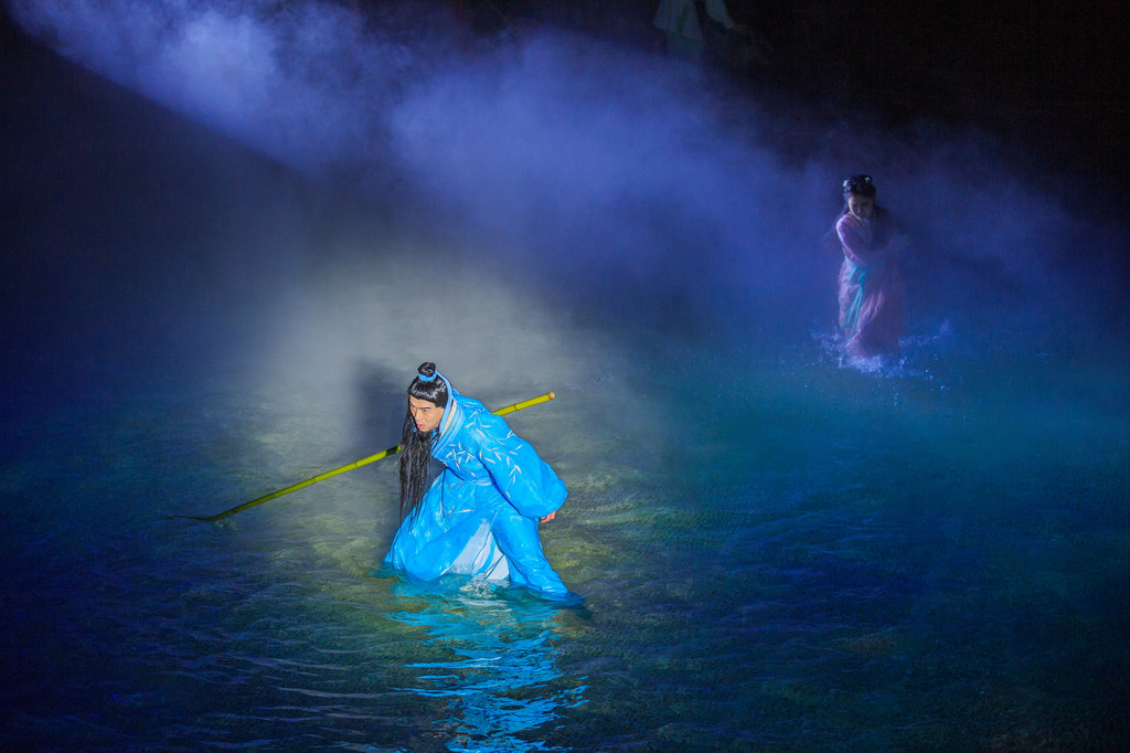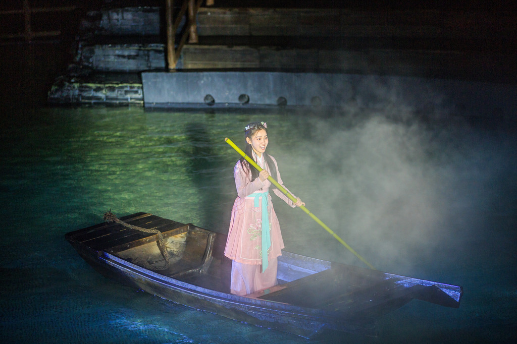 一群浣纱女子们与老渔翁完成一段关于严子陵和汉光武帝同塌而眠、无官而归新安江的对话。闪烁的灯光加上水面的倒影和水雾让整个表演区显得格外梦幻,再次显现出了雾中剧场的奇特景象,令人目眩神迷。