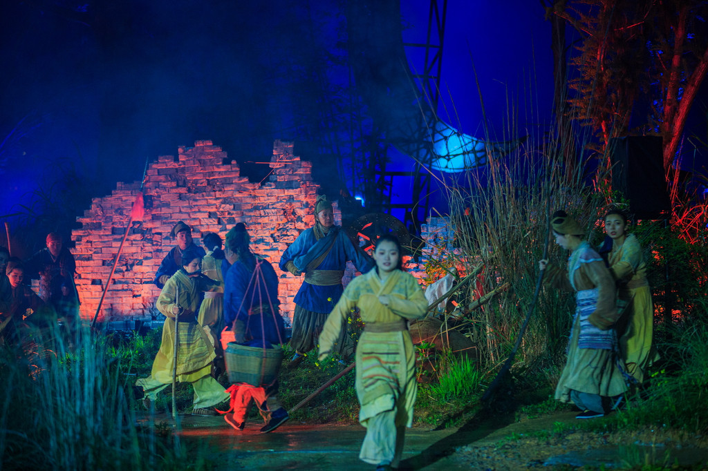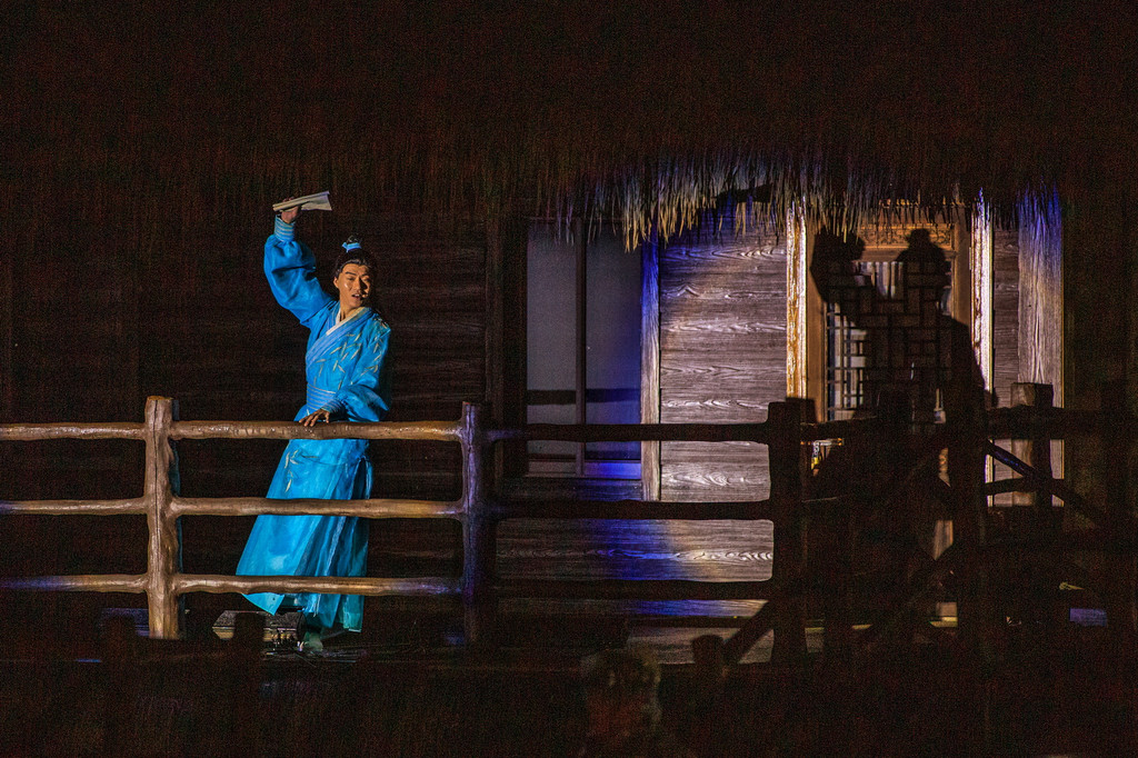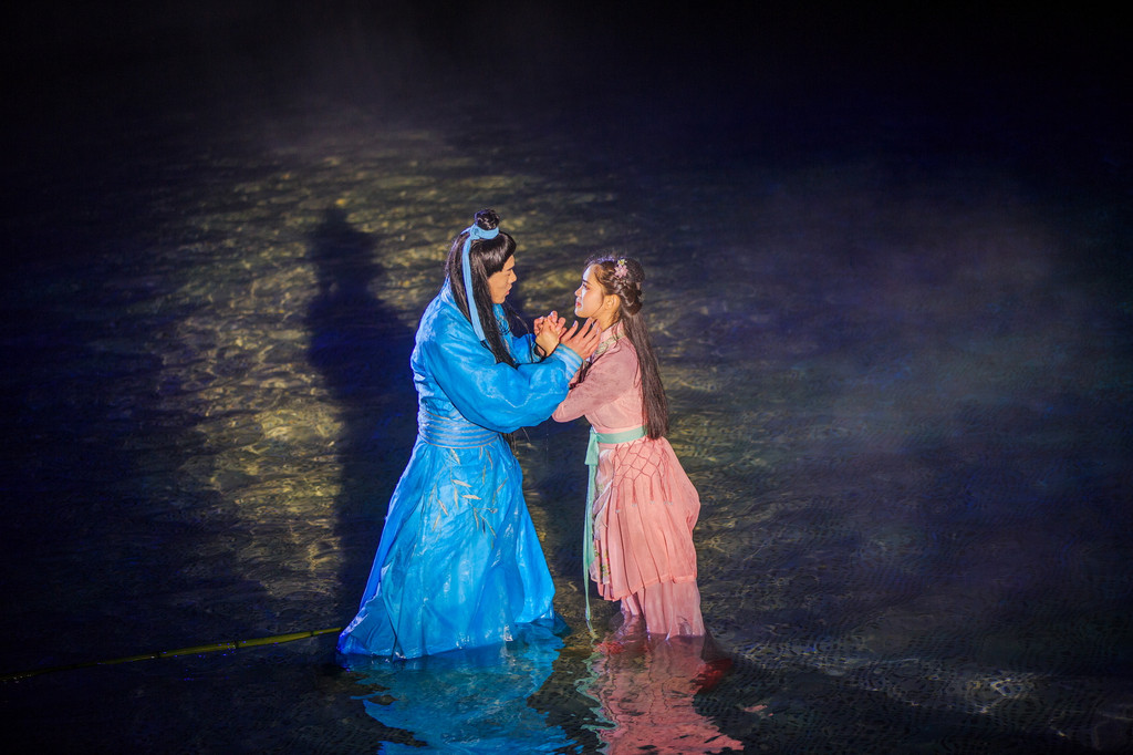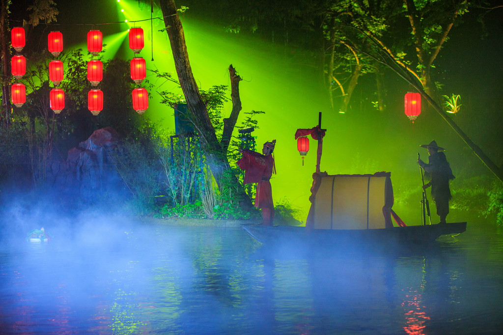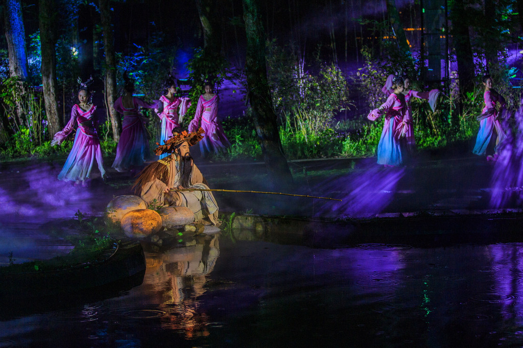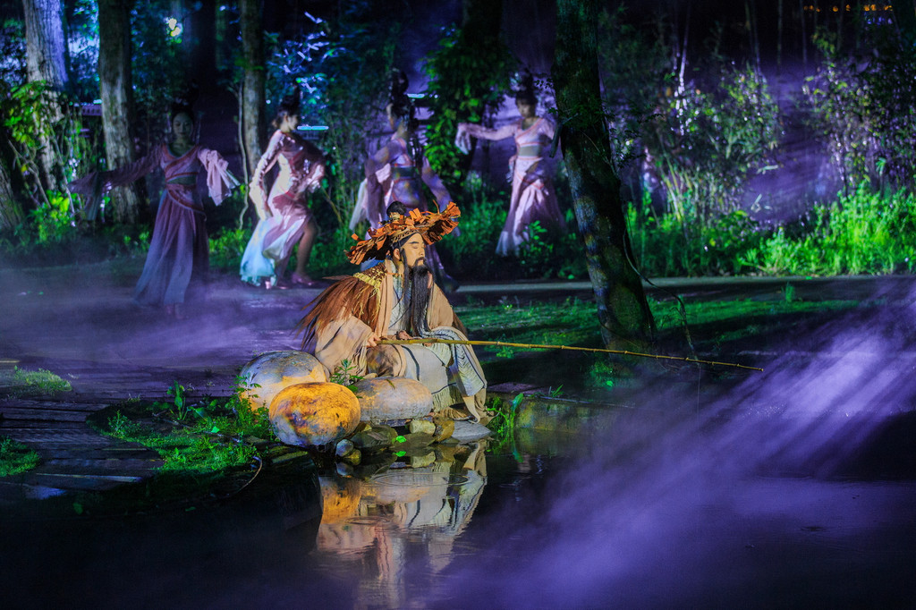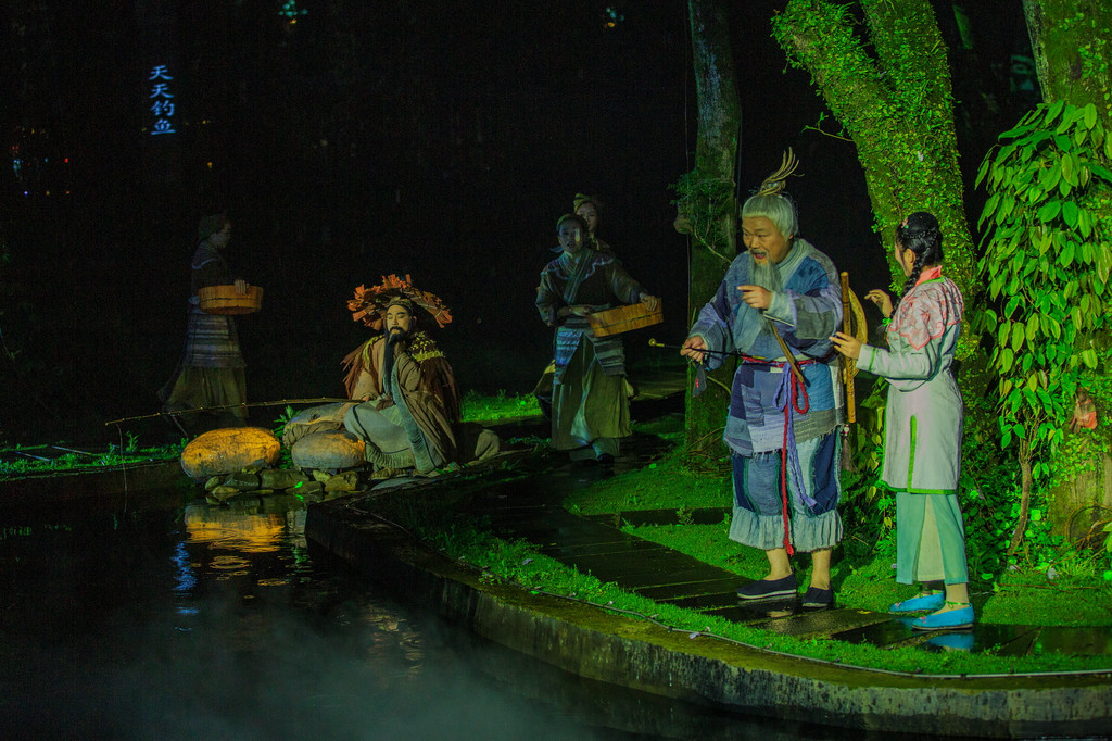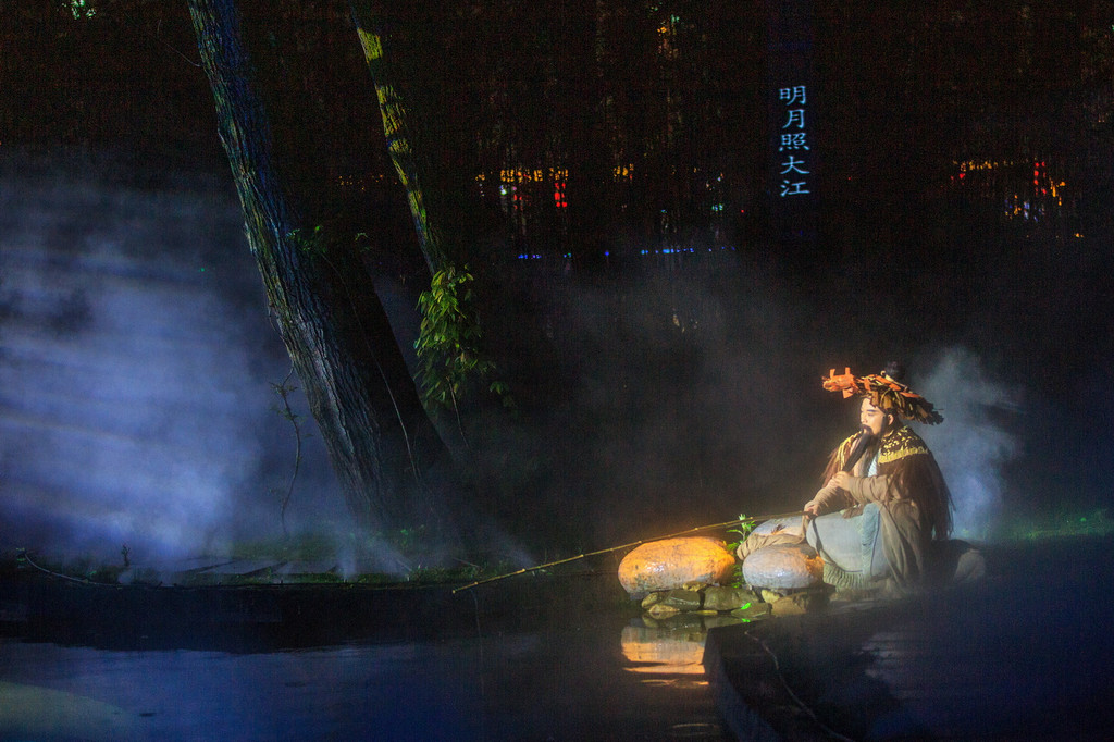 一群浣纱女子们与老渔翁完成一段关于严子陵和汉光武帝同塌而眠、无官而归新安江的对话。闪烁的灯光加上水面的倒影和水雾让整个表演区显得格外梦幻,再次显现出了雾中剧场的奇特景象,令人目眩神迷。