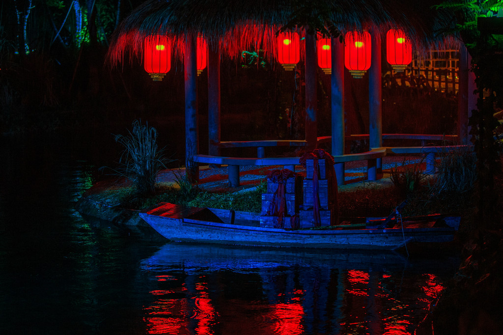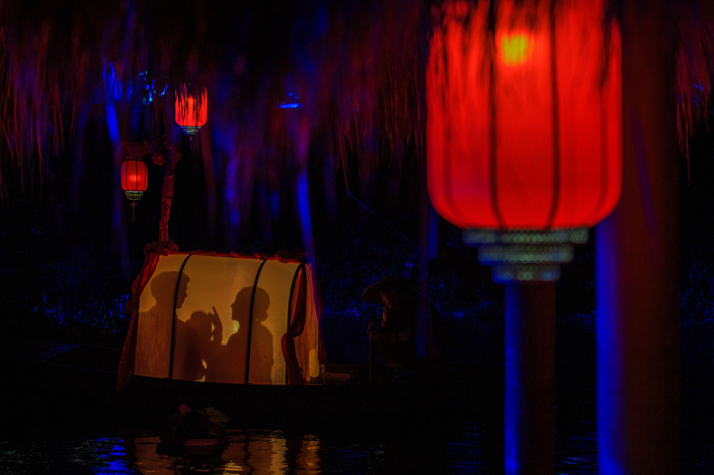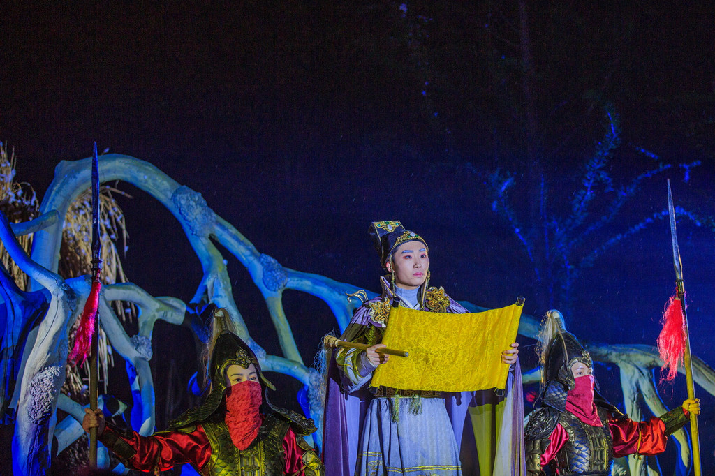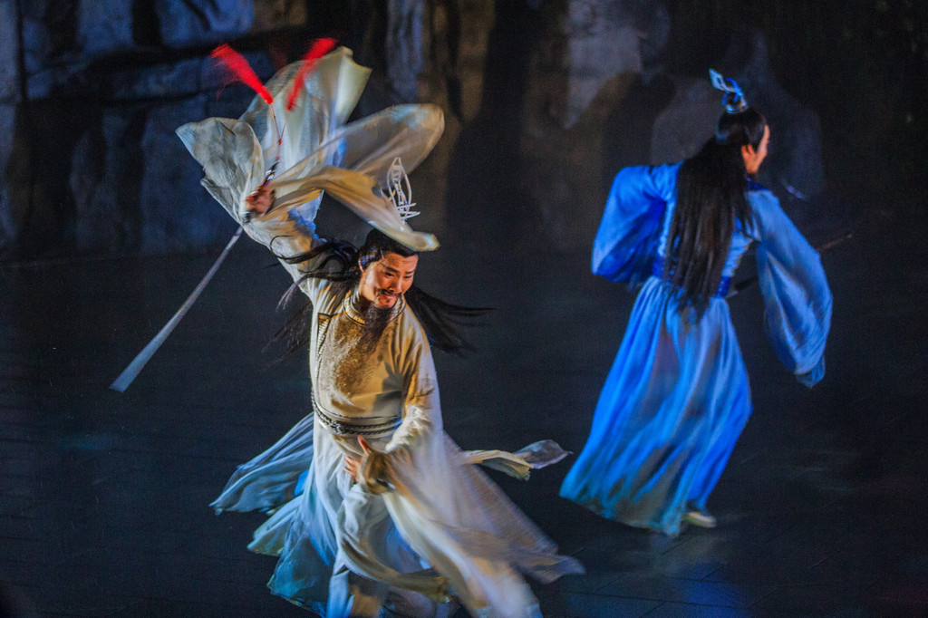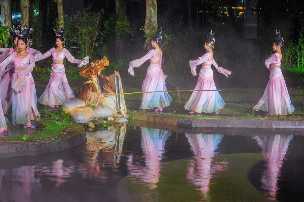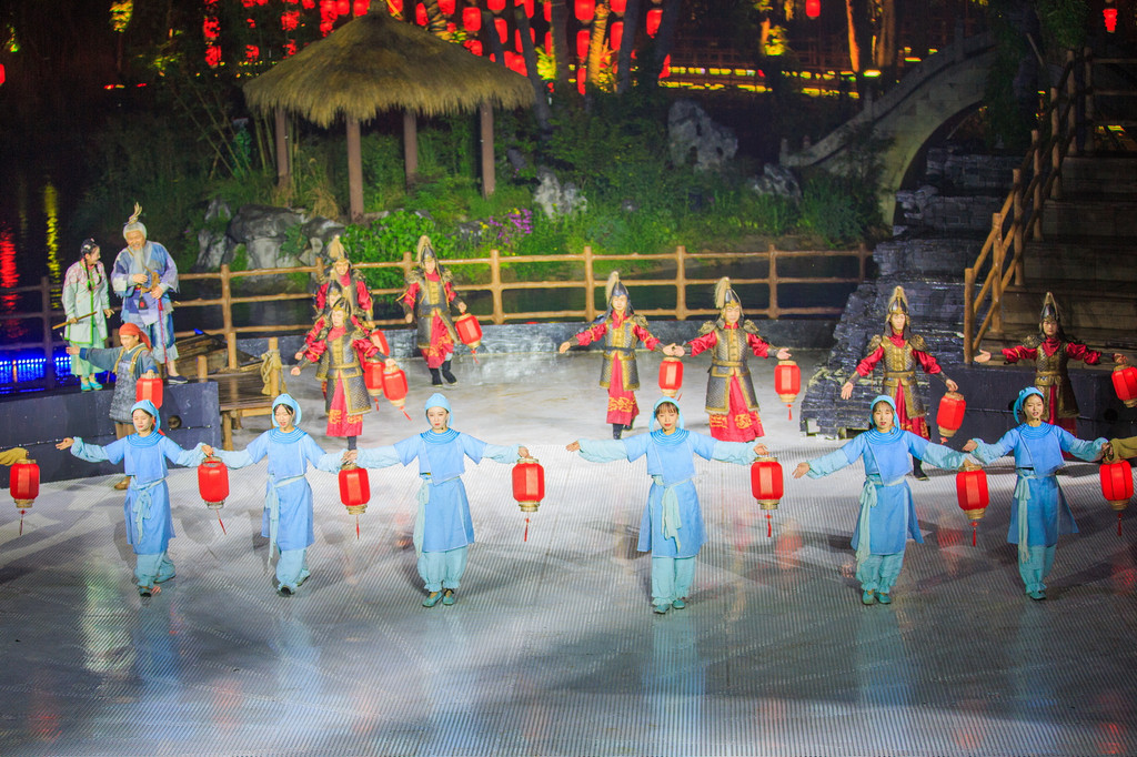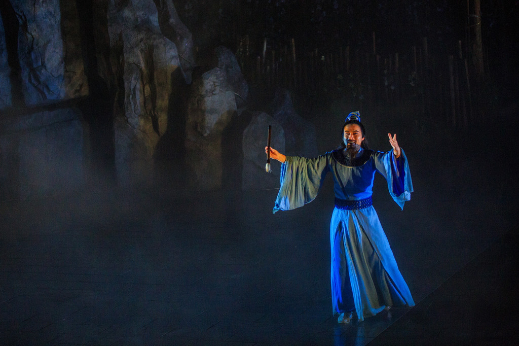 一群浣纱女子们与老渔翁完成一段关于严子陵和汉光武帝同塌而眠、无官而归新安江的对话。闪烁的灯光加上水面的倒影和水雾让整个表演区显得格外梦幻,再次显现出了雾中剧场的奇特景象,令人目眩神迷。