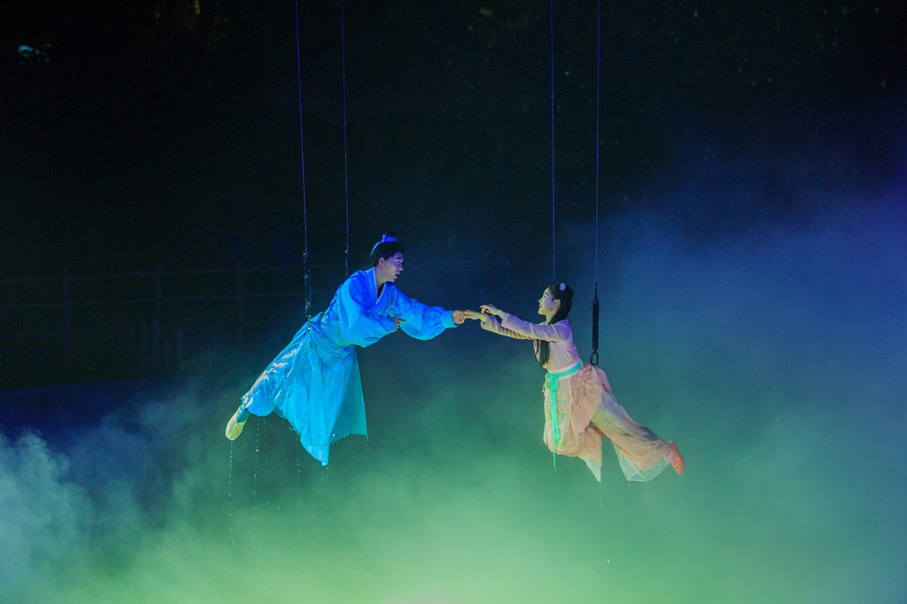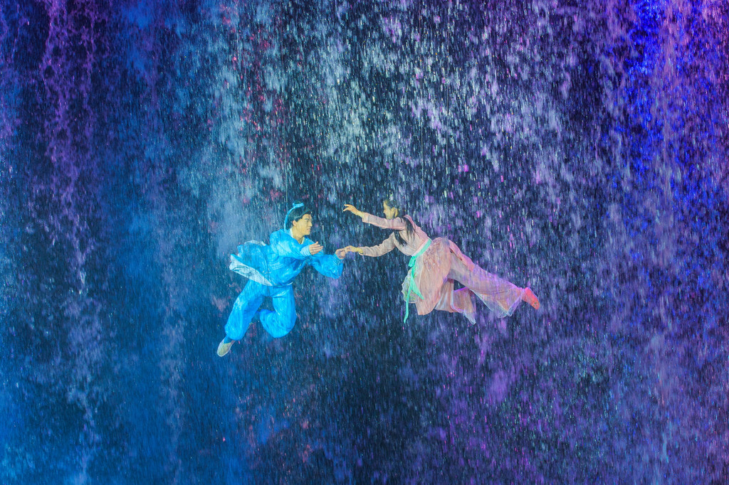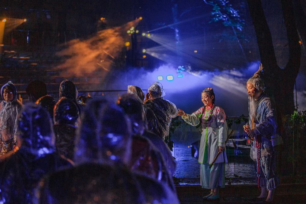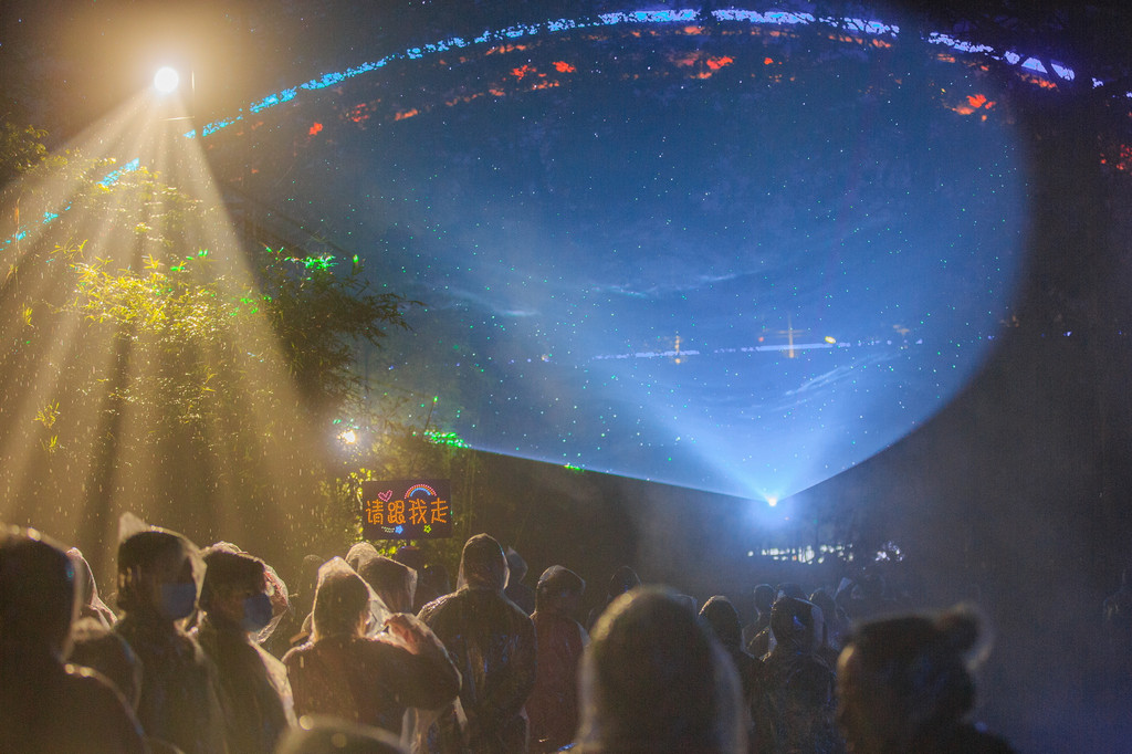 现场利用大型高架喷涌水系统营造江面、滔天巨浪、新安江大坝等形象,让演员表演空间与投影中的自然物融为一体,形成人影互动表演,仿佛让观众走进一个绝美的超现实世界。