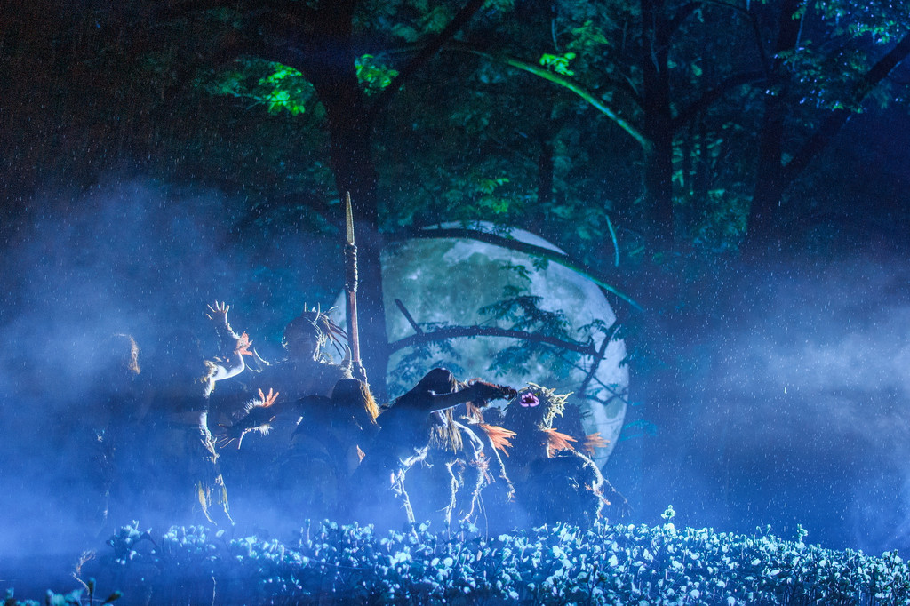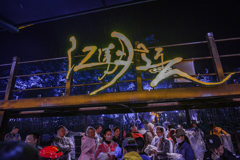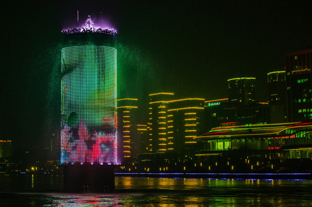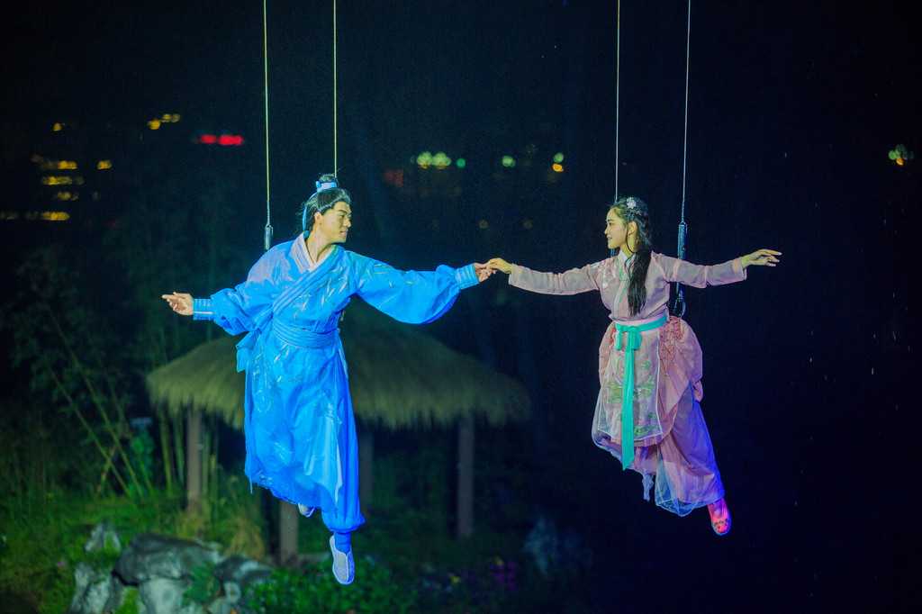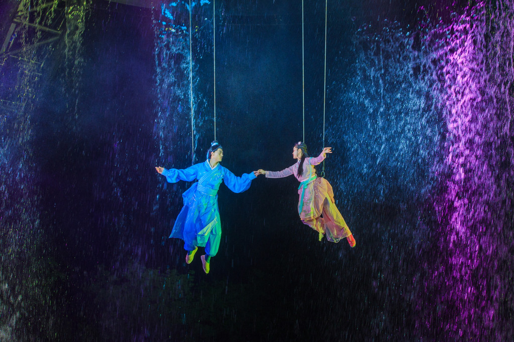 现场利用大型高架喷涌水系统营造江面、滔天巨浪、新安江大坝等形象,让演员表演空间与投影中的自然物融为一体,形成人影互动表演,仿佛让观众走进一个绝美的超现实世界。