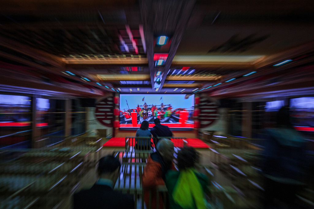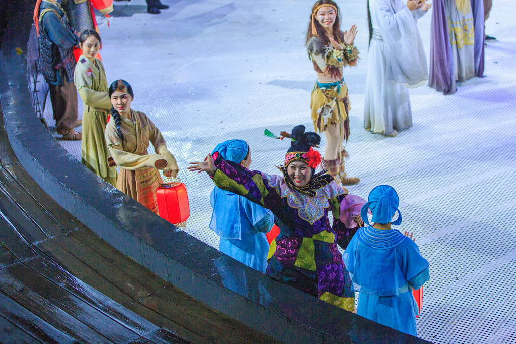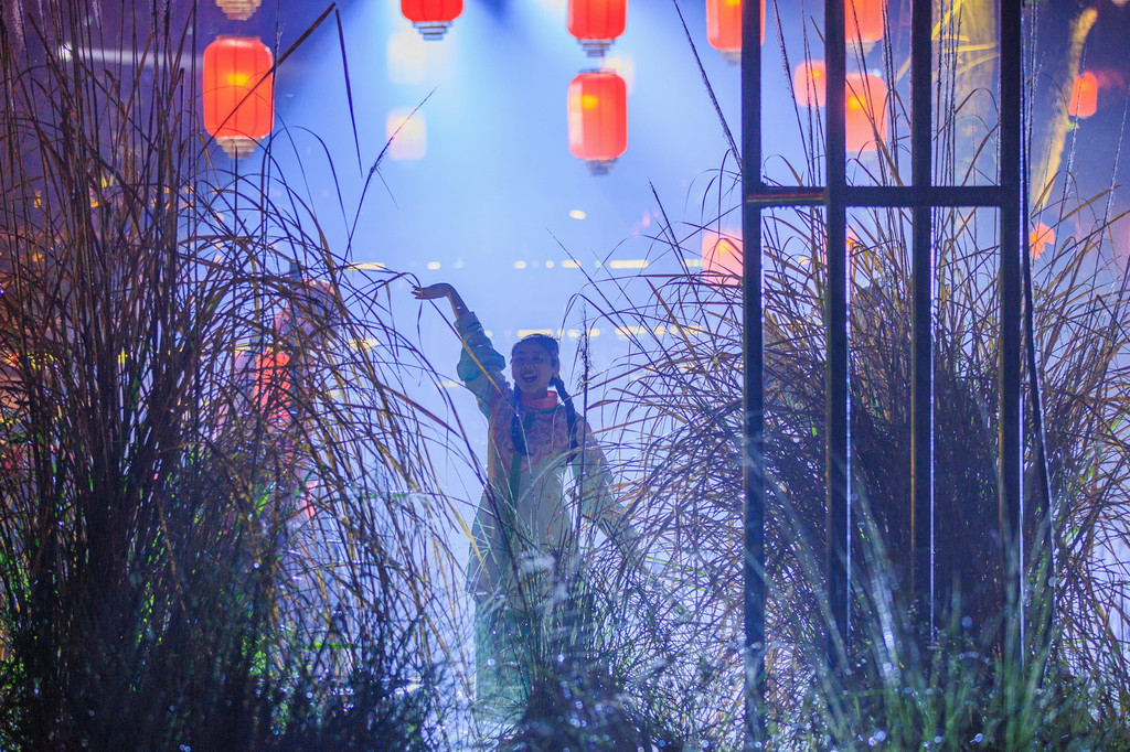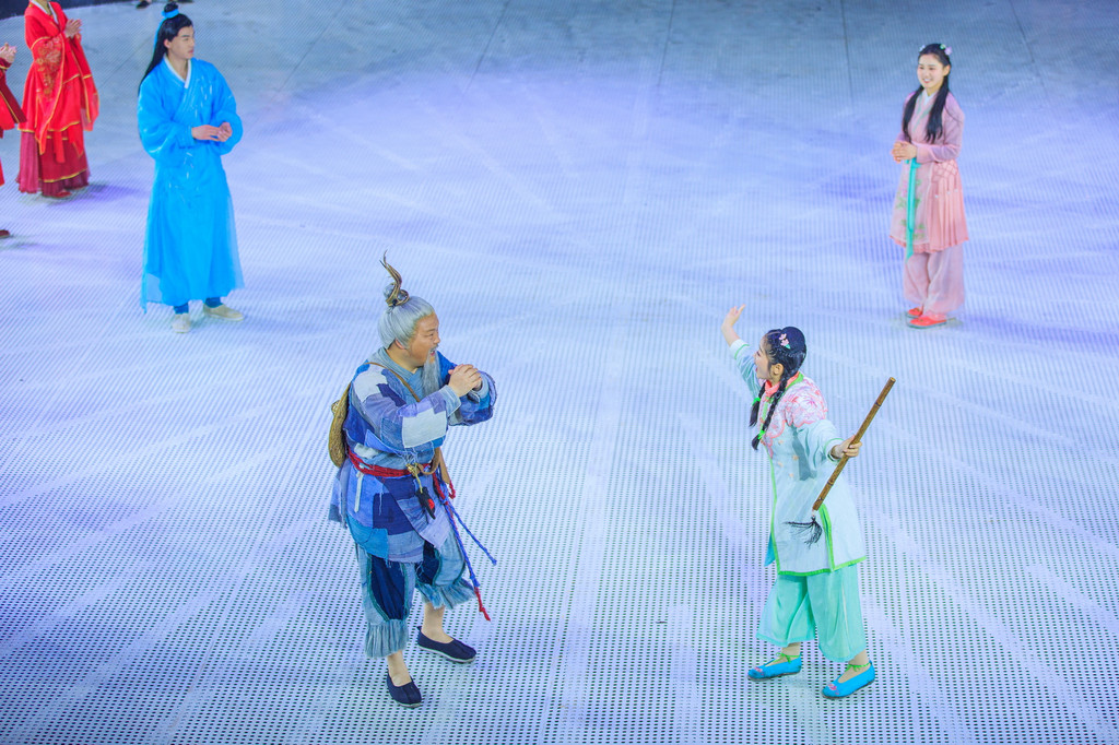 表演区的地上,一册铺满路径的诗卷一页页翻开,无数大大小小的唐诗诗句以拆分汉字的形式开始漂浮在空中。