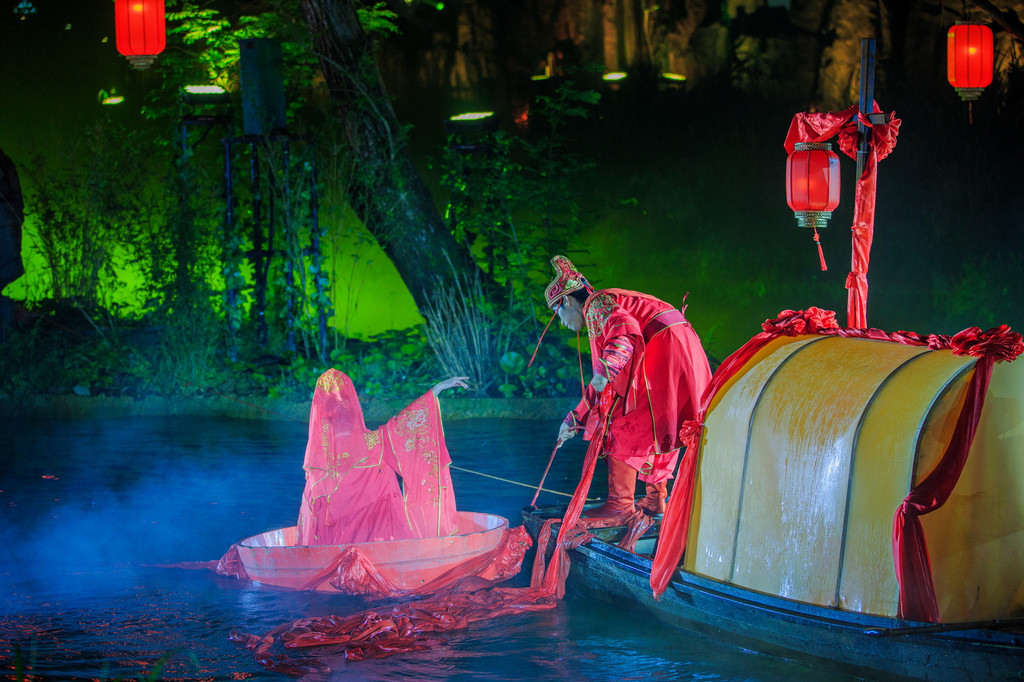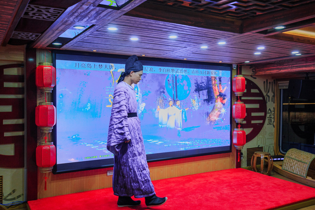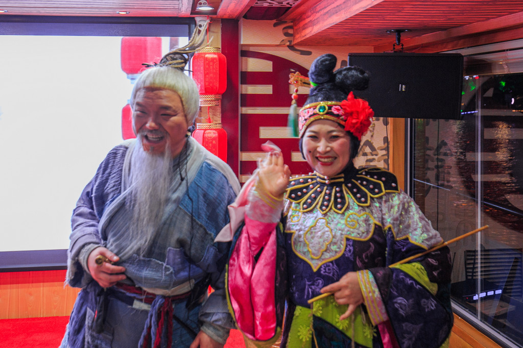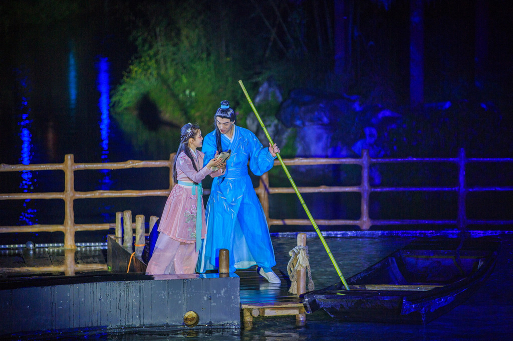 而游船上一老一少两名主演和媒婆等演员以弹唱形式对接下来的演出五幕进行点题式铺垫也为乘坐游船增添了不少乐趣。