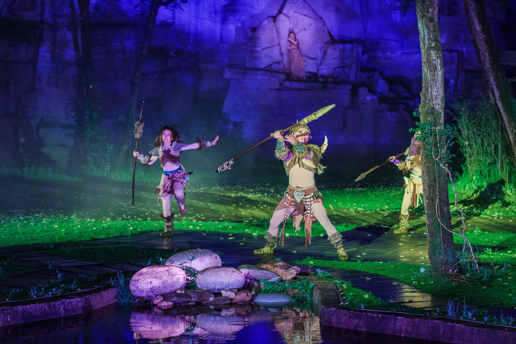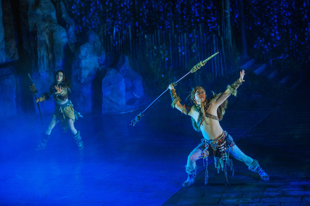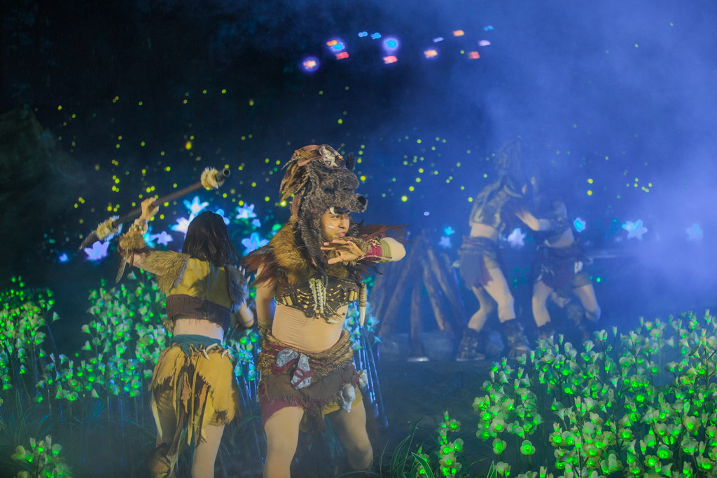 其实因为是实景演出,演员的表演区就紧邻第一排的观看区,甚至有不少“原始人”会直接冲到台前来与观众互动,不过不用担心,所有的演员对于这个接触的尺度把握的还是相当精准的,绝对不会跨越雷池(演出场地与观看席间有一条分割线)半步的,而后排的观众也不用担心前排会遮挡视线,几乎每一幕的演出都是有坡度,阶梯式的舞台或者观看席可以让每一位观众的都能很好的观赏到整个演出的细节。
