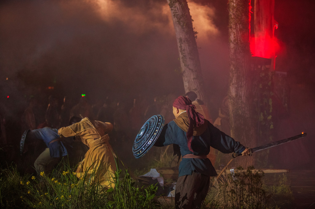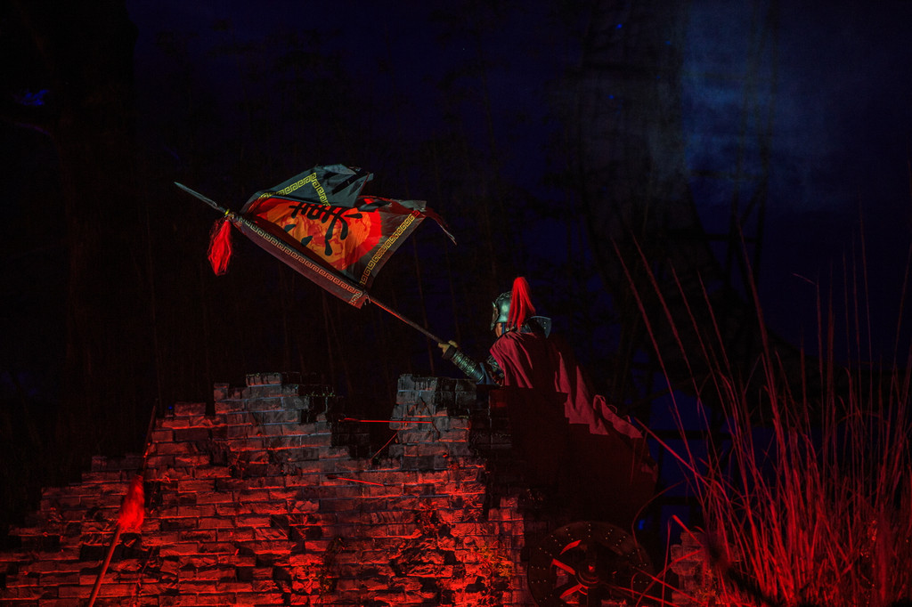 这一幕虽然不及最后一幕震撼,然而实际也是表演层次最丰富,观赏感最强的一幕,两边不断仓皇逃难的难民近在咫尺,头顶不断飞驰而过的火炮,营造出一种前所未有的现场感,整个演出场景不论从布景还是演员的表演都相当真实,即便是眼观六路耳听八方也很难一次性完全看清整个表演的全部,所以这段演出可谓是相当的用心,代入感极强。
